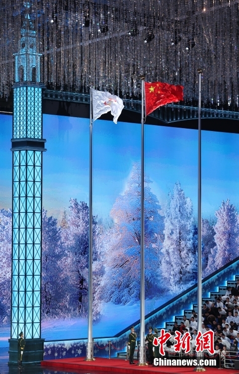 2月14日,第九届亚洲冬季运动会闭幕式在黑龙江哈尔滨举行。图为闭幕式上的升旗仪式。