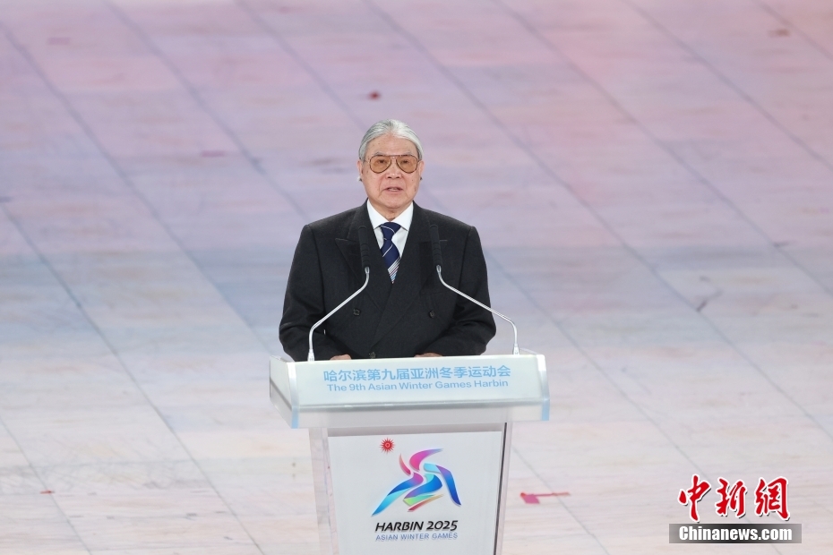 2月14日,第九届亚洲冬季运动会闭幕式在黑龙江哈尔滨举行。图为亚奥理事会第一副主席霍震霆致辞并宣布闭幕。