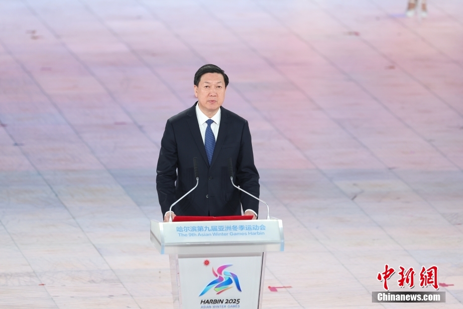 2月14日,第九届亚洲冬季运动会闭幕式在黑龙江哈尔滨举行。图为哈尔滨第九届亚冬会组委会主席、中国奥委会主席高志丹致辞。
