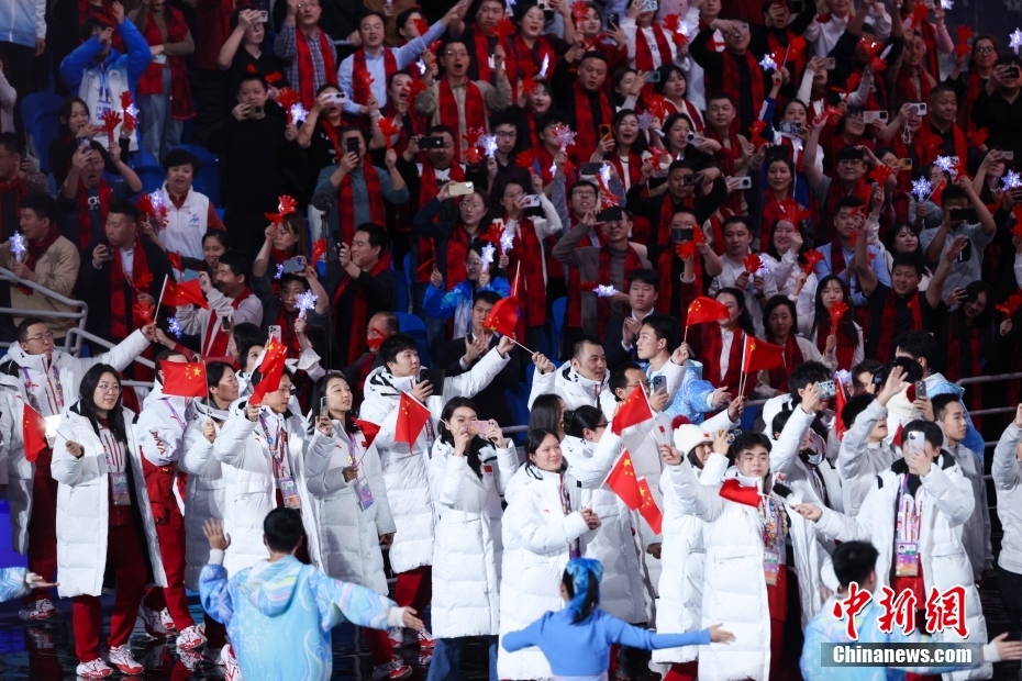 2月14日,第九届亚洲冬季运动会闭幕式在黑龙江哈尔滨举行。图为中国体育代表团亮相。