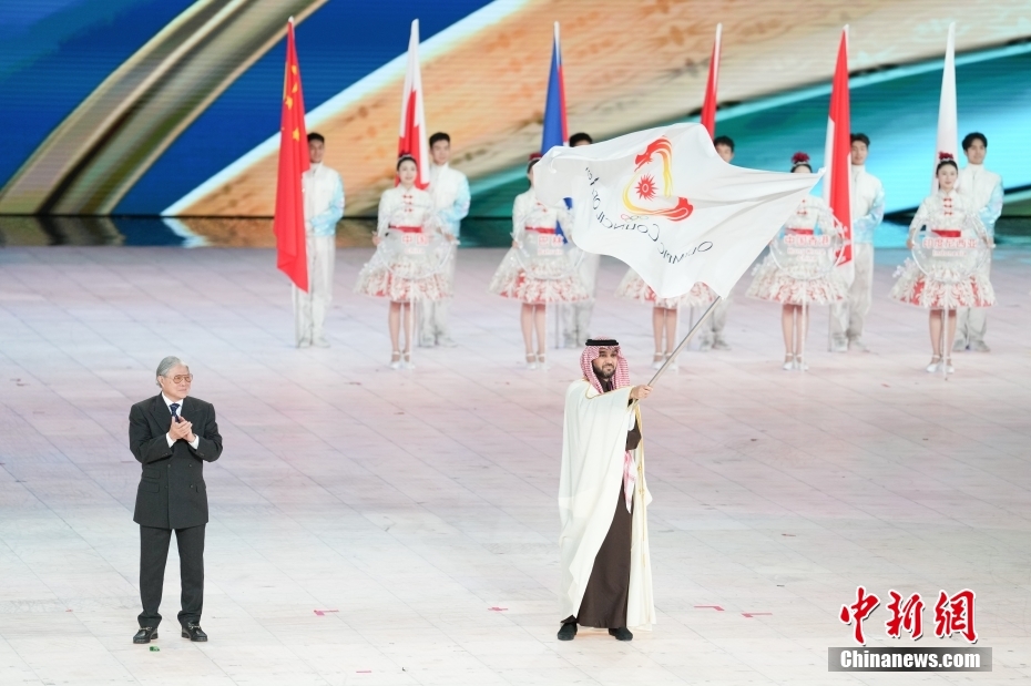 2月14日,第九届亚洲冬季运动会闭幕式在黑龙江哈尔滨举行。图为亚奥理事会会旗交接仪式。