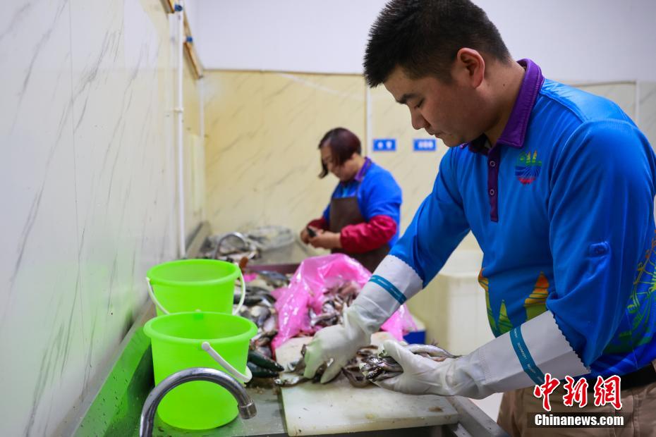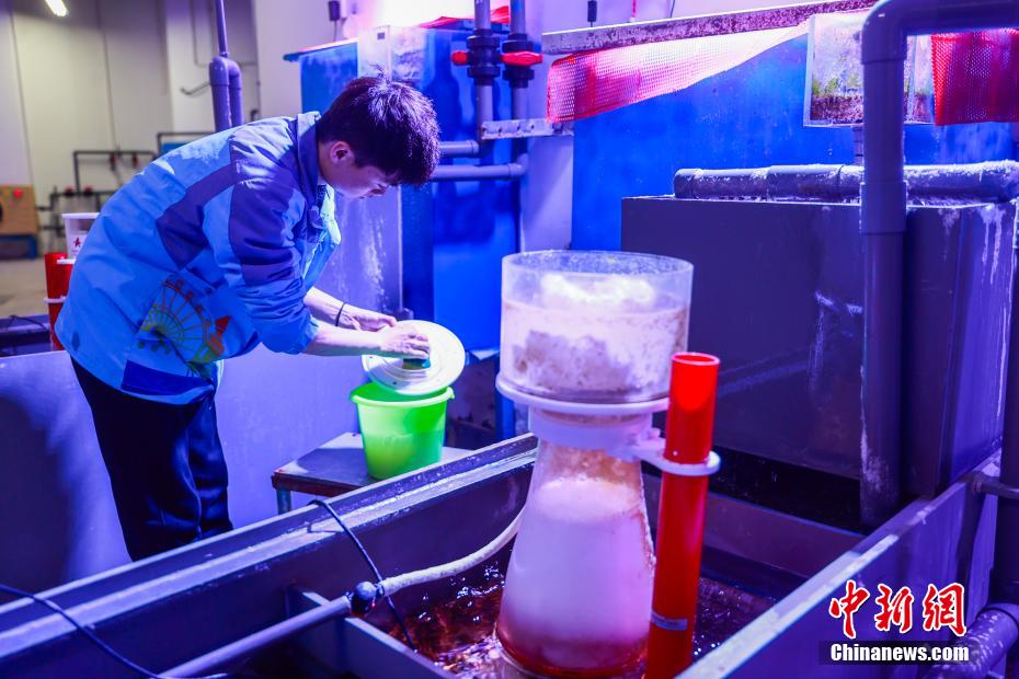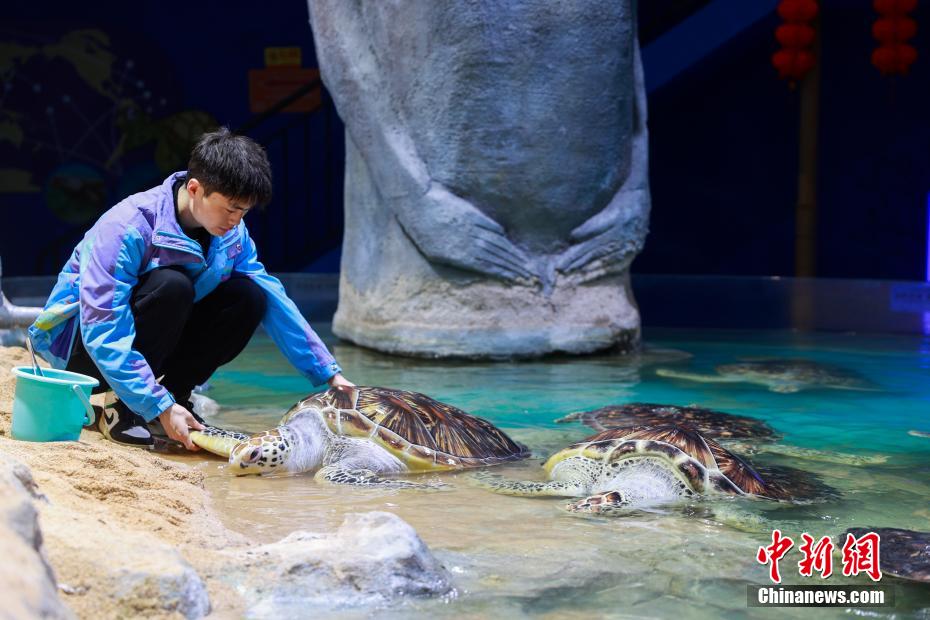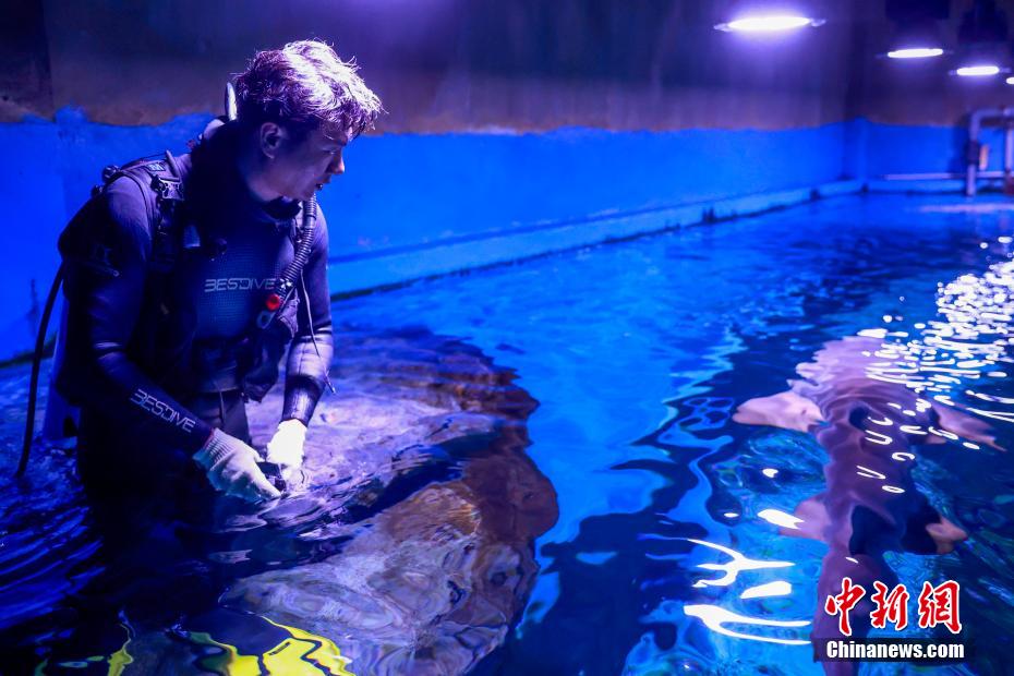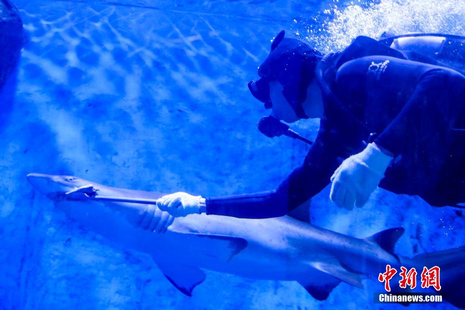 2月19日,位于青海省西宁市的西宁新华联童梦乐园综合旅游度假区海洋馆内,工作人员对馆内动物进行全面细致的“体检”,便于掌握动物们的身体状况,为更优质的饲养和护理提供依据。该馆是目前世界海拔最高的大型综合海洋馆。图为工作人员为鲨鱼投喂饵料。中新社记者 薛蒂 摄
