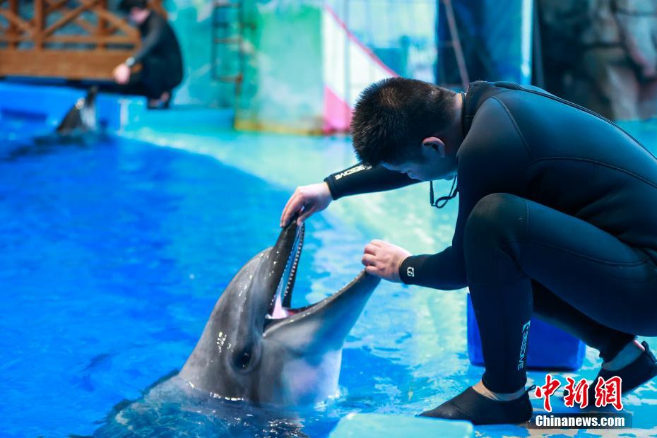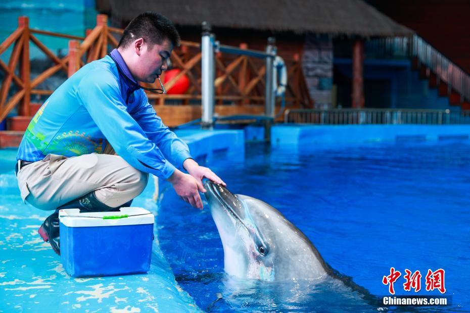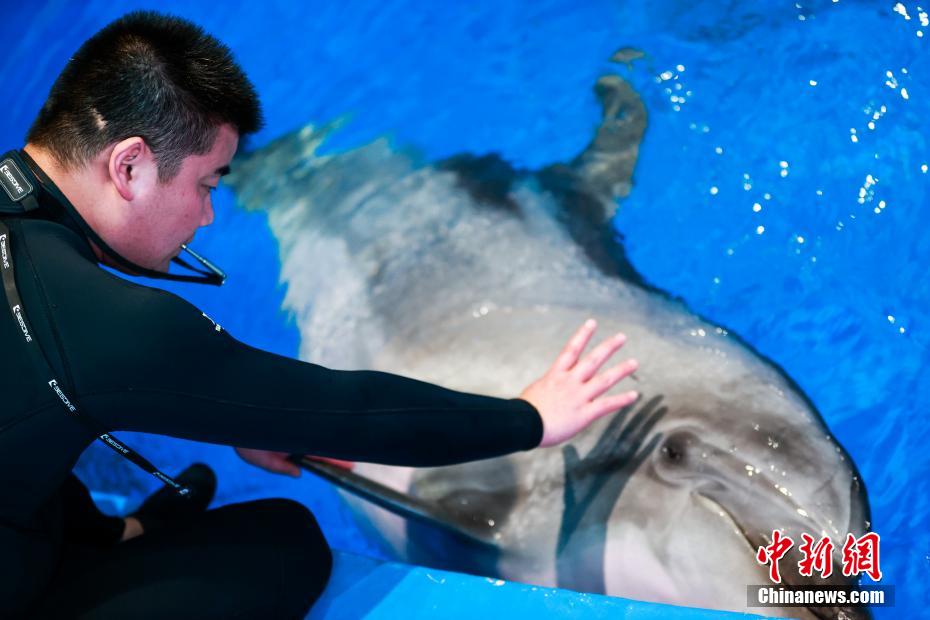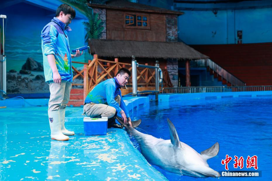 图为工作人员检查海豚皮肤状况。