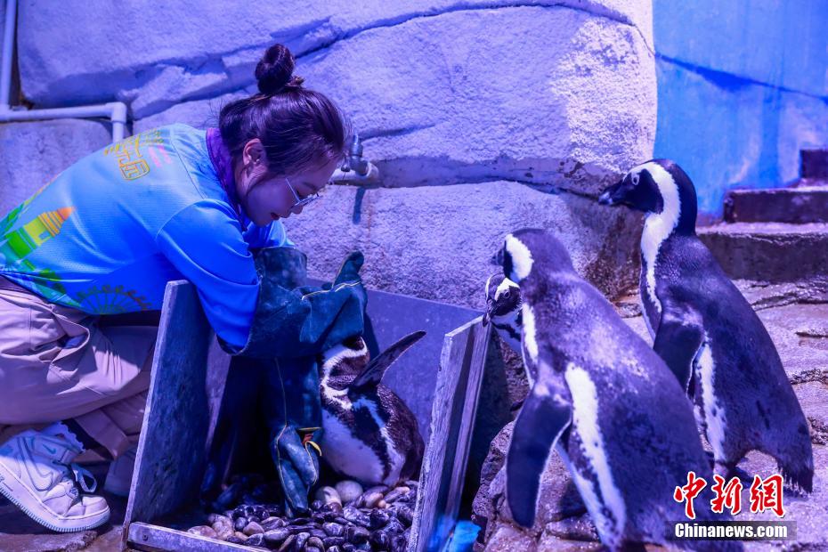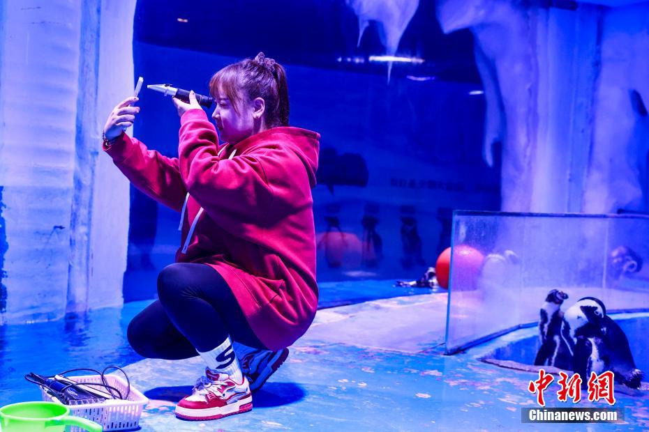 图为工作人员为企鹅做“体检”。