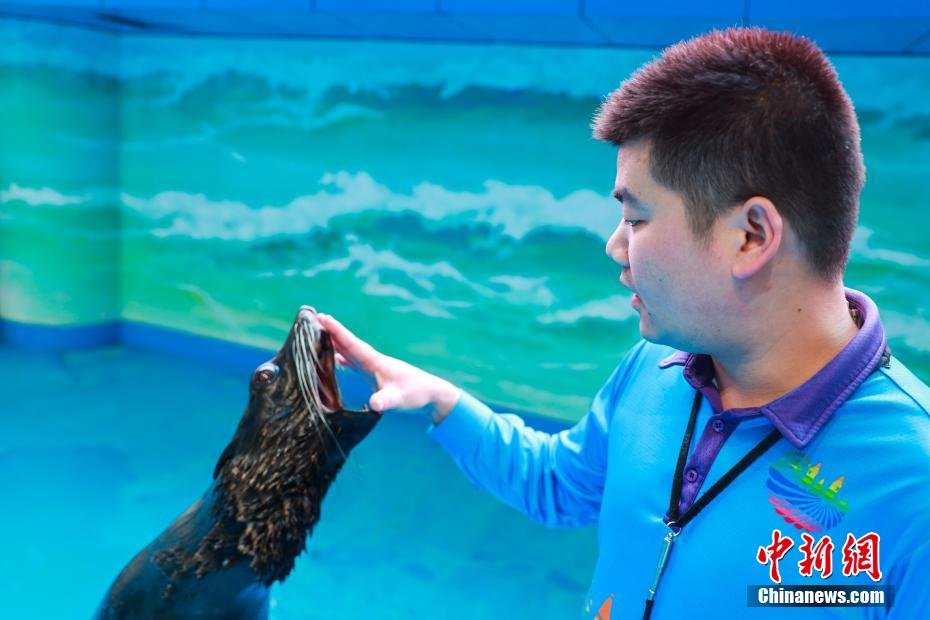 图为工作人员给海狮做“体检”。