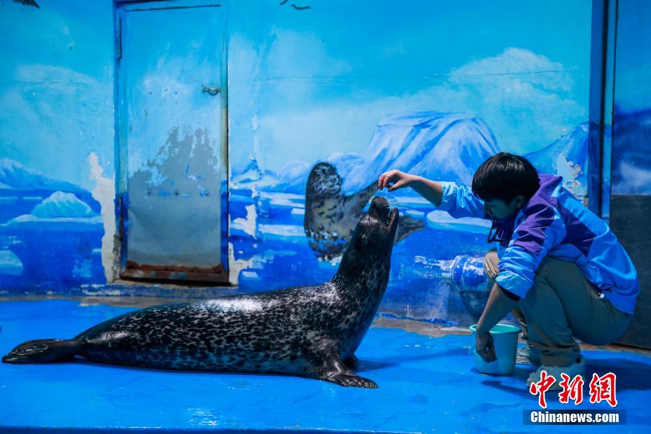 图为工作人员检查斑海豹皮肤状况。