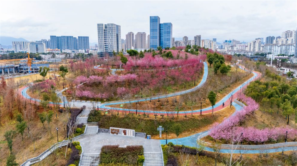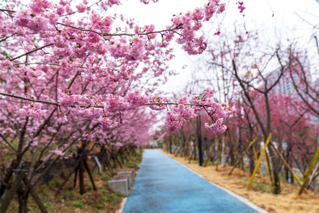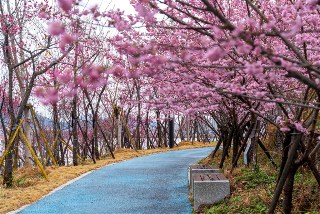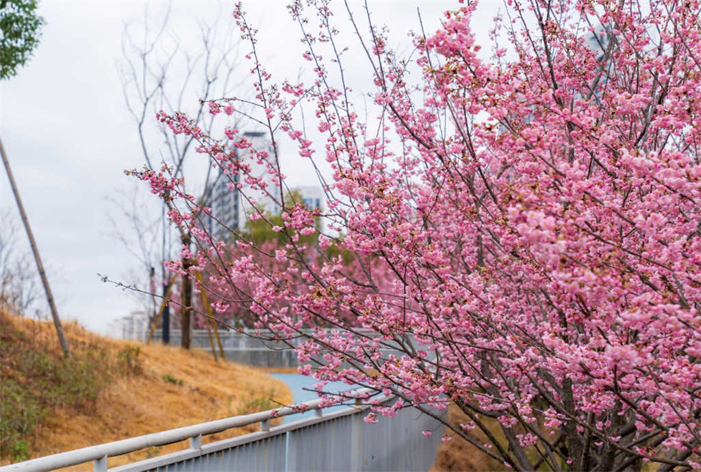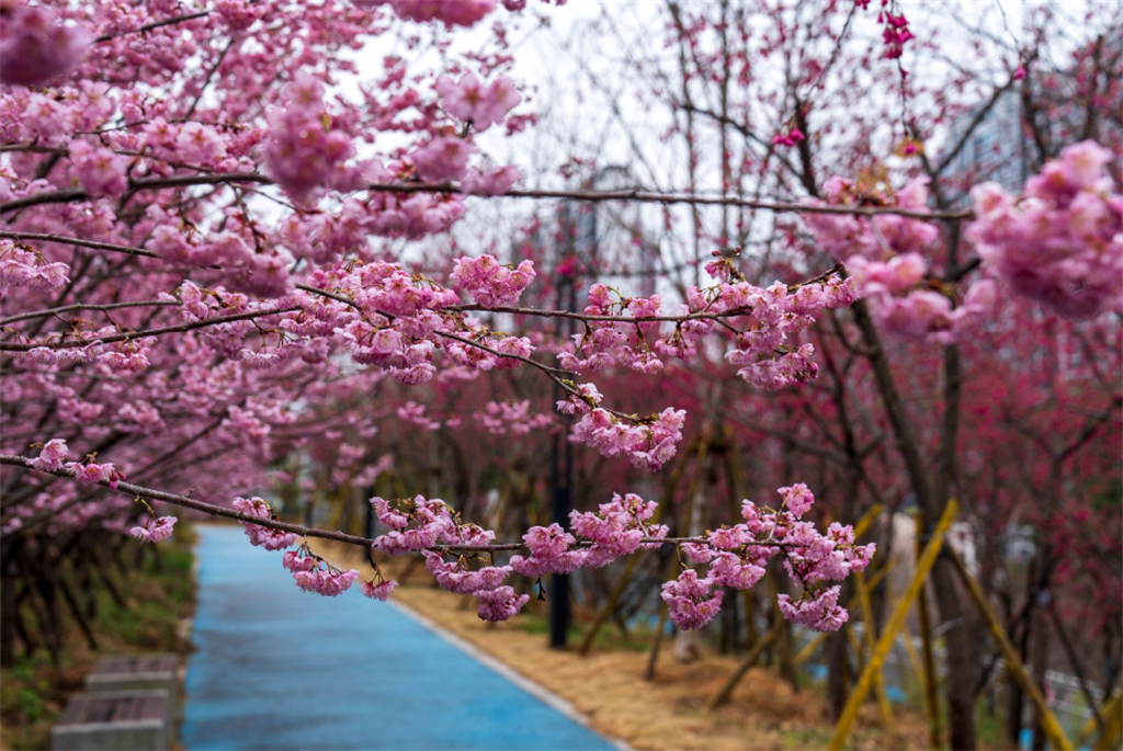 近日,位于鹿城区滨江街道桃花岛公园的早樱已悄然绽放。摄影: 刘伟