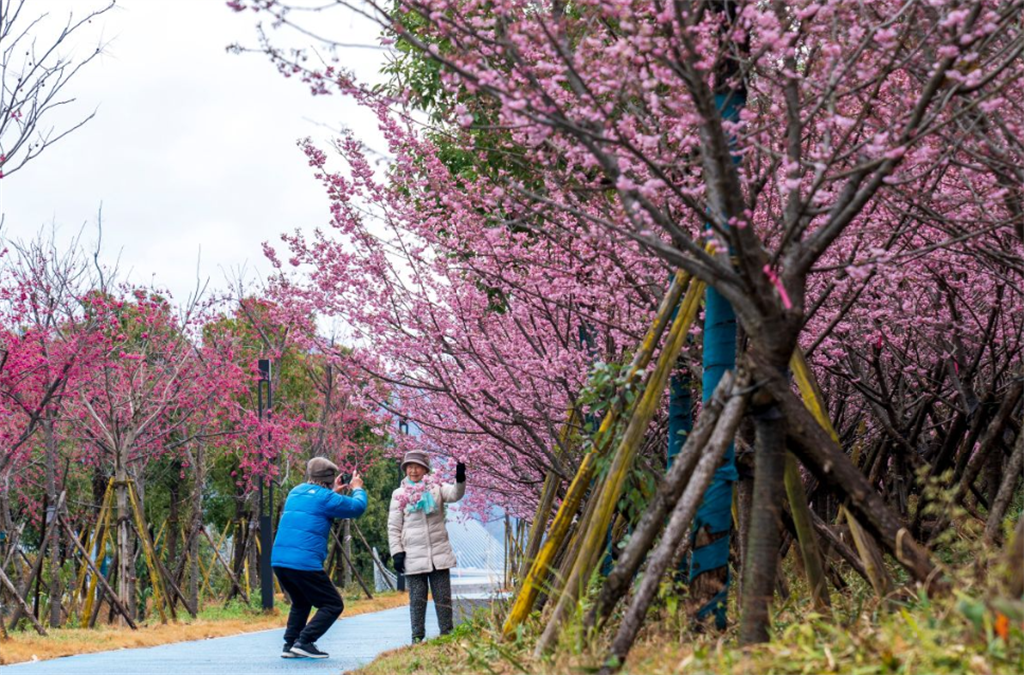 早樱进入初花期,吸引了众多市民纷纷前来拍照打卡。摄影: 刘伟