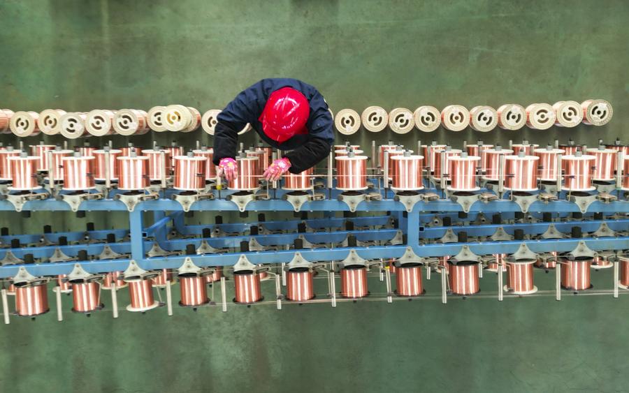 2月13日,在山东省东营市广饶县李鹊镇的一家电缆公司的生产车间内,工人在进行束丝作业(无人机照片)。新华社发(刘云杰摄)