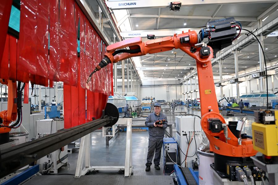 2月18日,工人在唐山国家高新技术产业开发区中信重工开诚智能装备有限公司车间内调试机器人产品。新华社记者 牟宇 摄