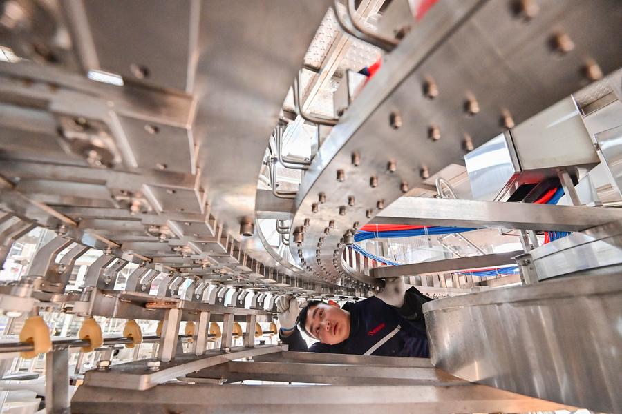 2月14日,在山东省青州经济开发区一家灌装设备制造企业,工人在车间内装配作业。新华社发(王继林摄)