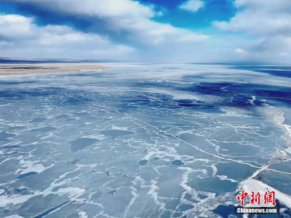 惊蛰时节,封冻地“高原蓝宝石”青海湖冰面开裂,一块块湖冰静静漂浮,在阳光照射下尽显斑驳之美。图为青海湖冰面出现裂纹。陈明章 摄