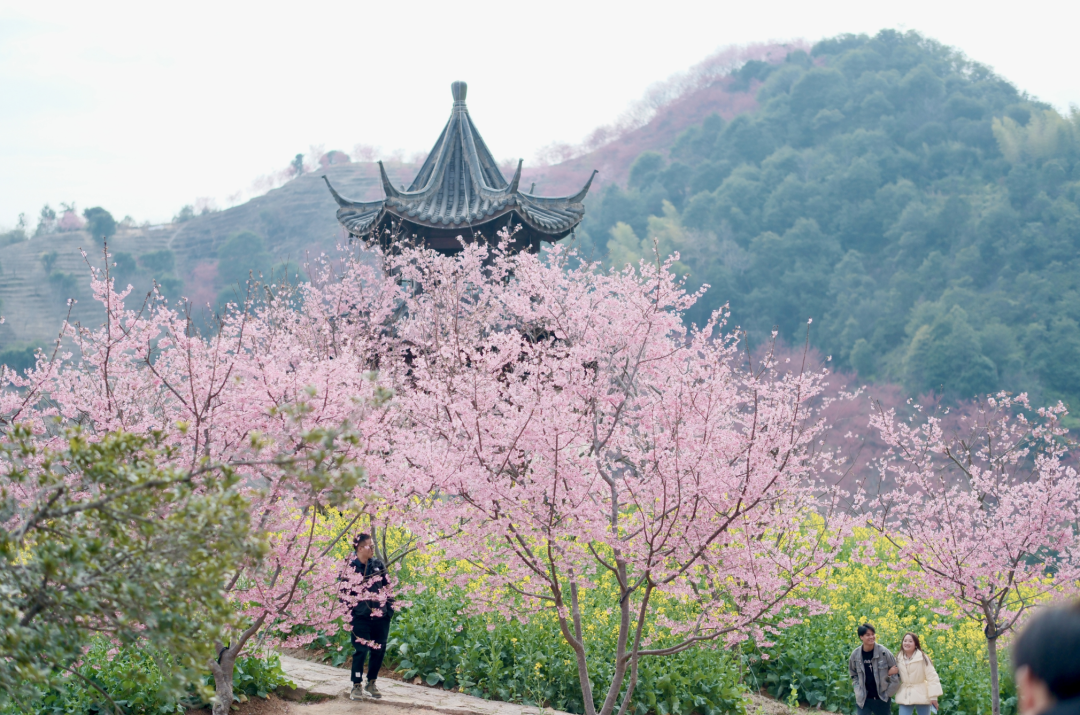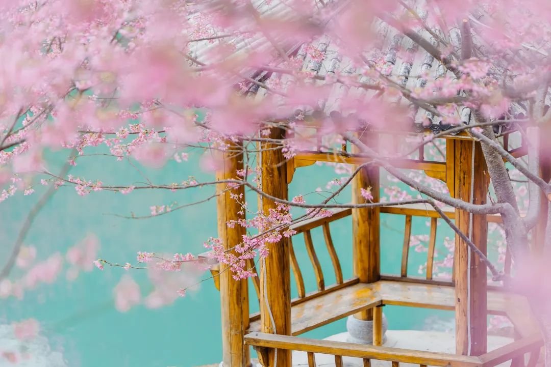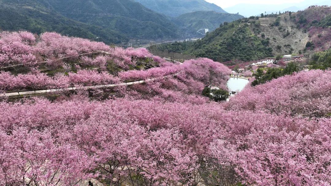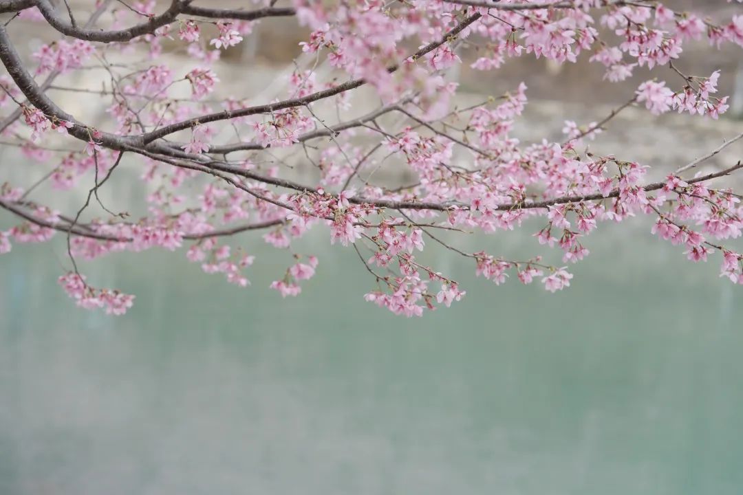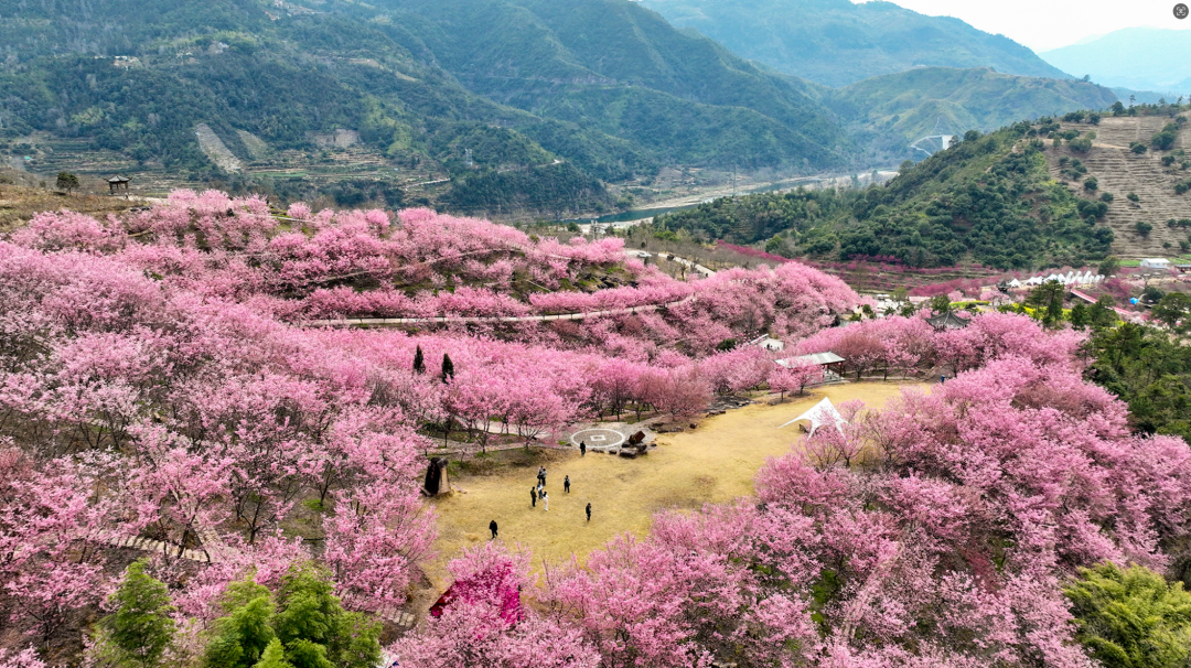 此刻正值早樱盛放,极目远眺,可以看到绯红与粉白交相辉映,宛如流动的云霞铺满山野。