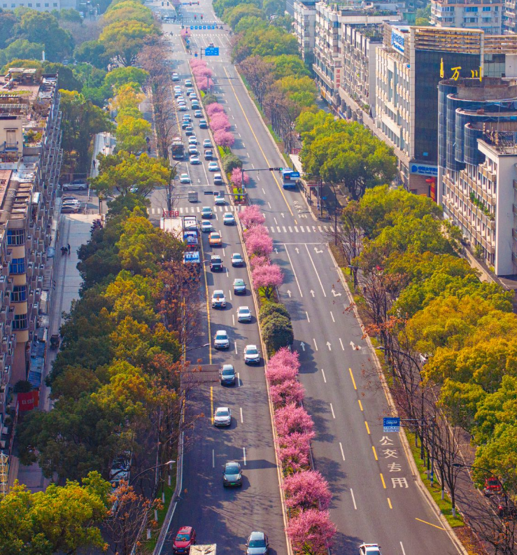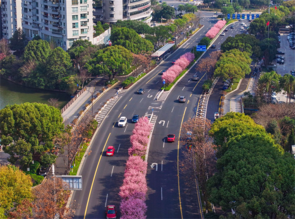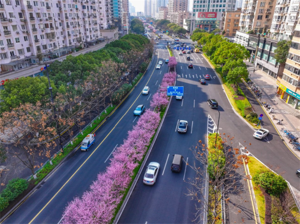 3月12日,温州市区府东路美人梅怒放,汽车从中穿梭而过,构成一幅车在花中行的春日美景。摄影: 苏巧将