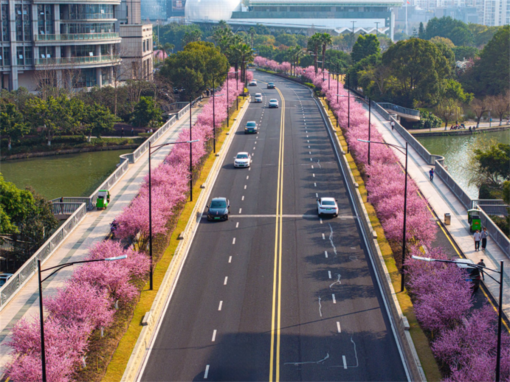 盛放的美人梅不仅为城市添上了一抹浪漫色彩,还吸引众多市民驻足欣赏、拍照留念。摄影: 苏巧将