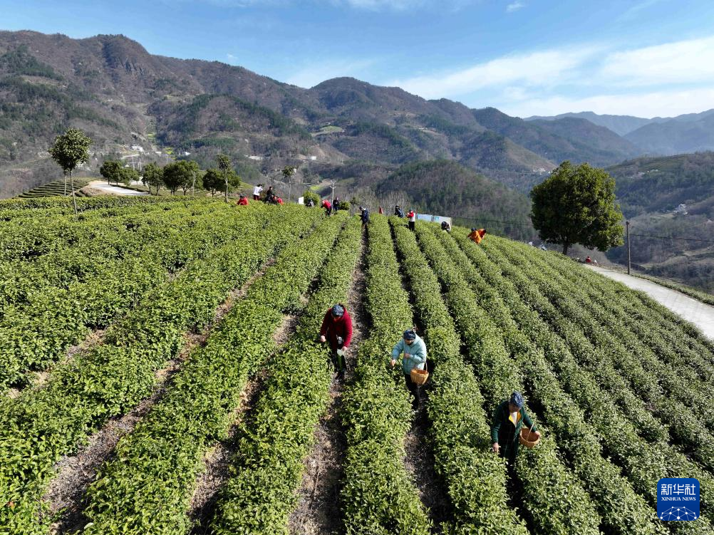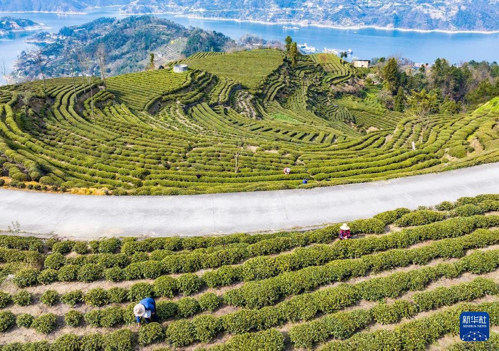 3月18日,湖北省宜昌市秭归县茅坪镇陈家坝村村民在茶园采摘新茶(无人机照片)。