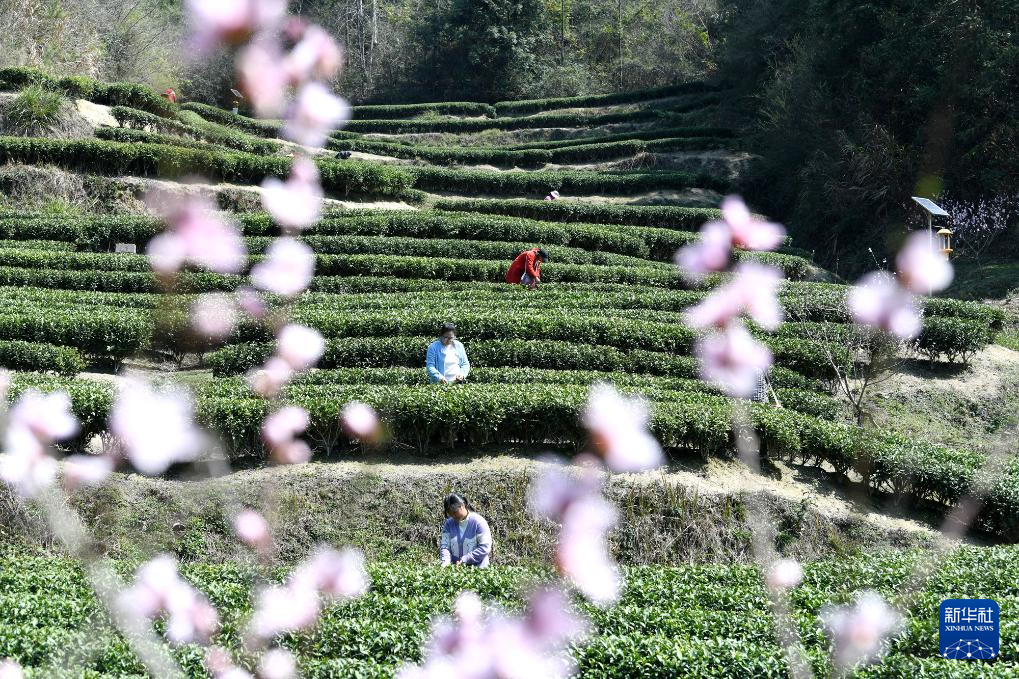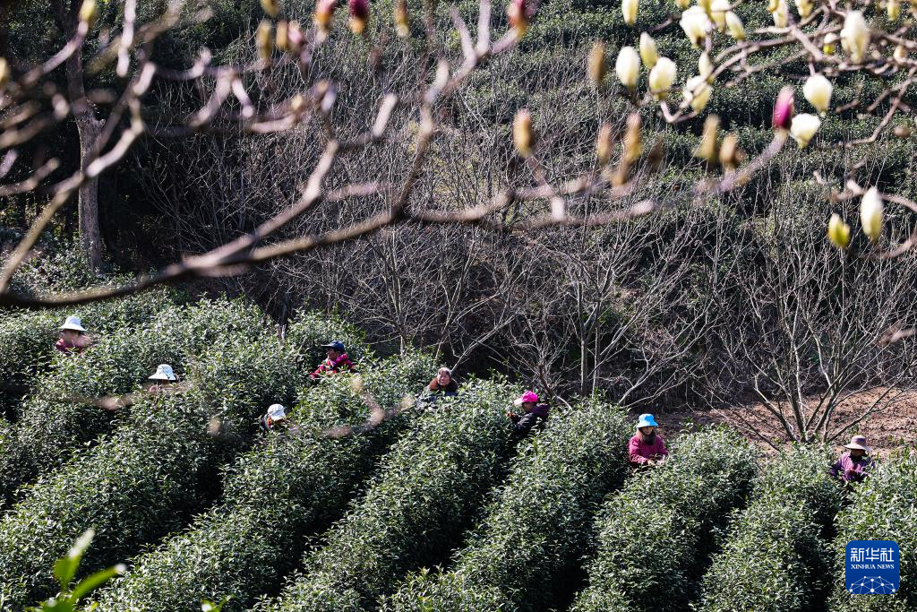 3月18日,茶农在湖北省咸宁市通城县四庄乡寺背村卧龙沟生态有机茶业专业合作社采摘茶叶。