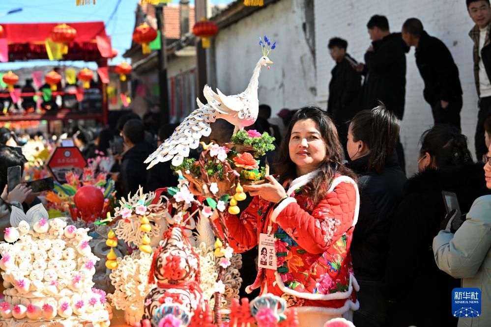 3月18日,在山西省岚县岚城镇,面塑师在展示自己的面塑作品。