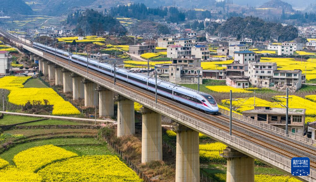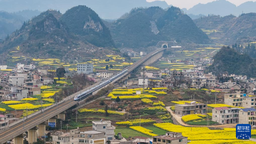 3月22日,列车在沪昆铁路黄桶至化处区间行驶(无人机照片)。仲春时节,贵州省多地油菜花竞相绽放。一趟趟列车在油菜花海之中穿行,勾勒出黔贵大地朝气蓬勃的春日景象。新华社记者 陶亮 摄