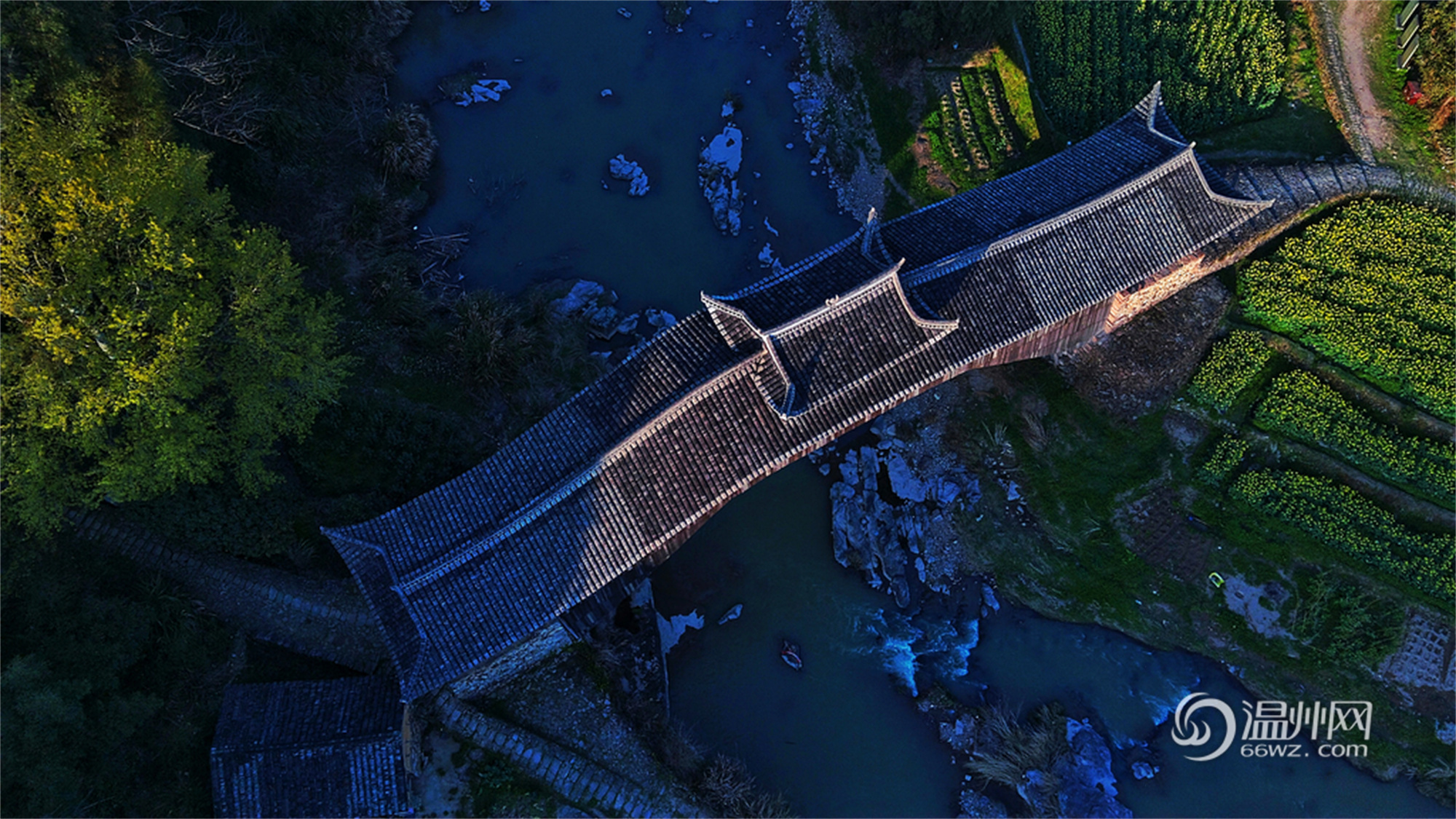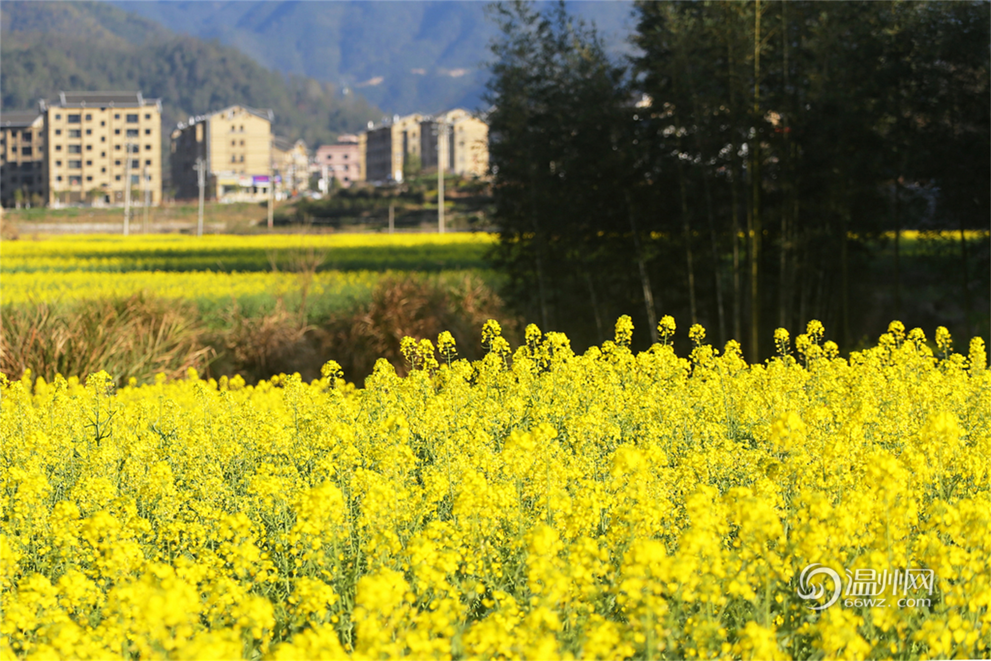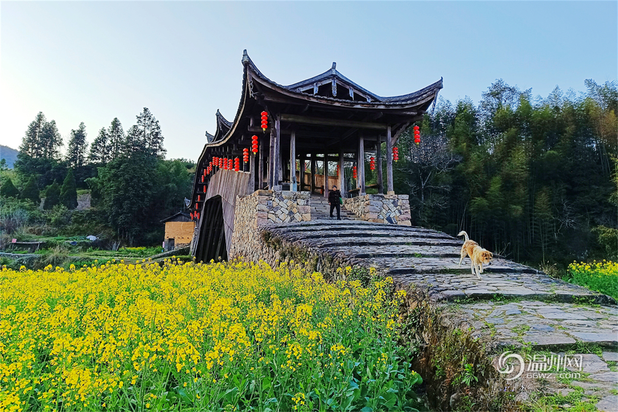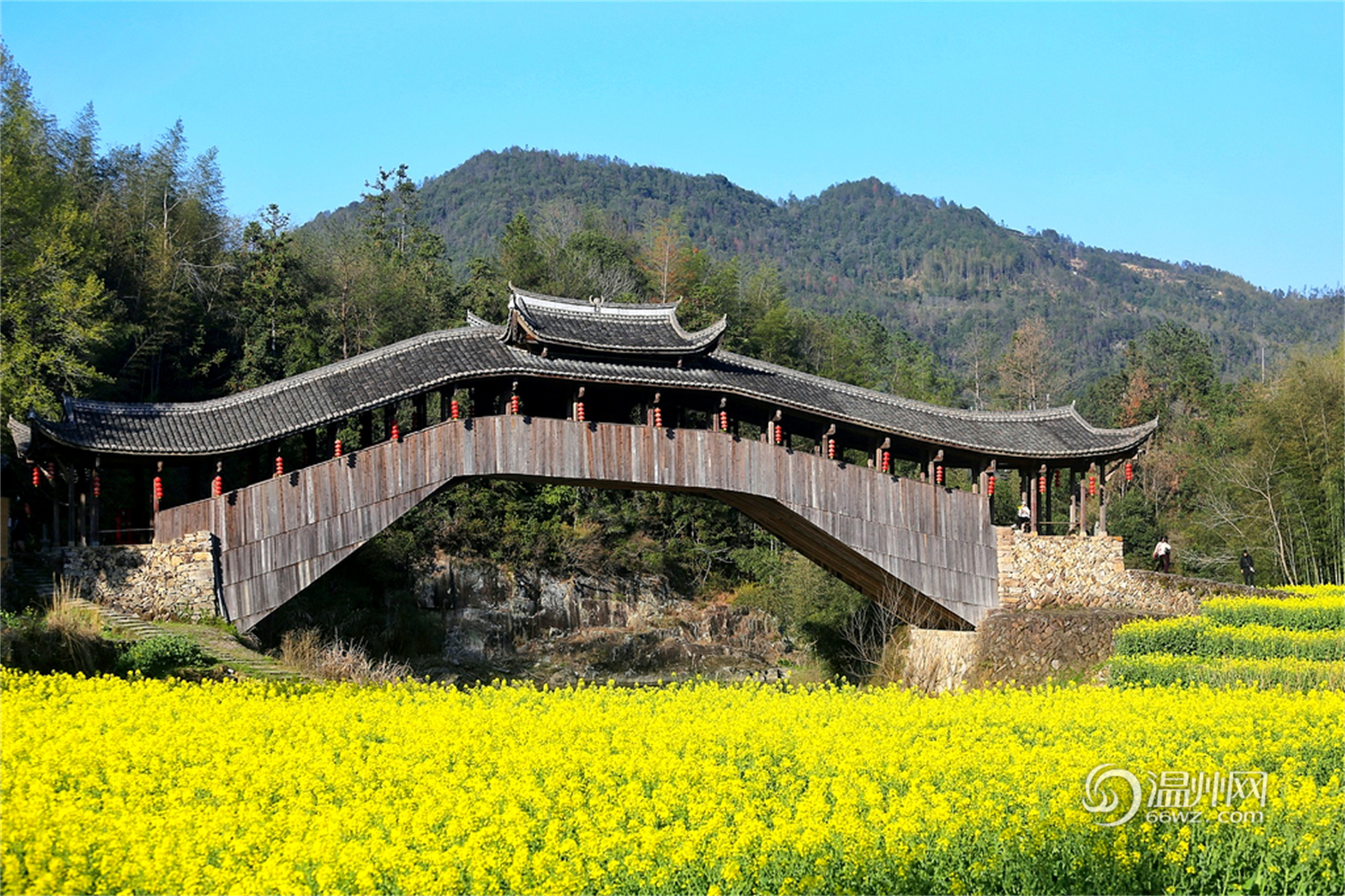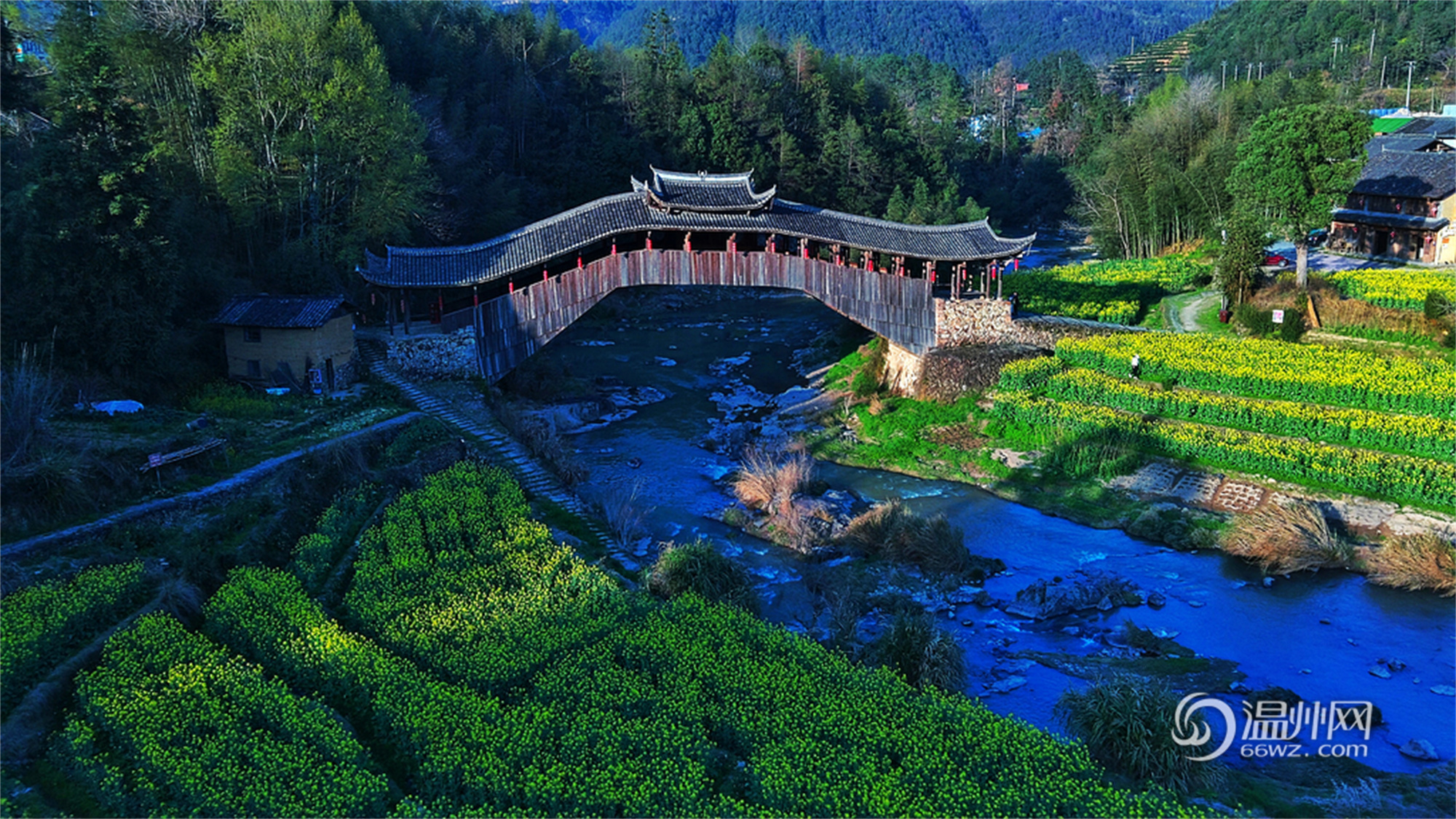 温州网讯(摄影 朱发满)随着春风的轻拂,泰顺筱村镇的文兴桥旁,一大片金黄色的油菜花悄然绽放。