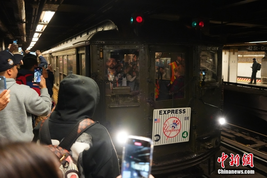 当地时间3月27日,为迎接美国职业棒球大联盟(MLB)纽约洋基队的主场比赛,纽约大都会交通局在中央车站和洋基球场间开行复古地铁专列(专列车辆在1917年至1960年间建造),当日仅开行两个单行车次,受到大批球迷追捧。图为专列进入中央车站地铁站。中新社记者 廖攀 摄