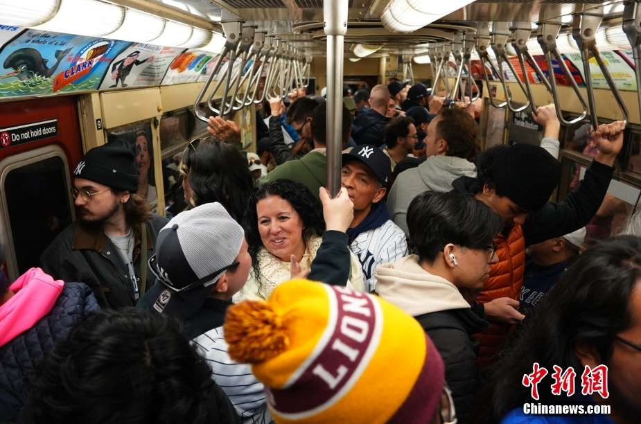 当地时间3月27日,为迎接美国职业棒球大联盟(MLB)纽约洋基队的主场比赛,纽约大都会交通局在中央车站和洋基球场间开行复古地铁专列(专列车辆在1917年至1960年间建造),当日仅开行两个单行车次,受到大批球迷追捧。图为球迷乘客在开行的复古地铁里。中新社记者 廖攀 摄