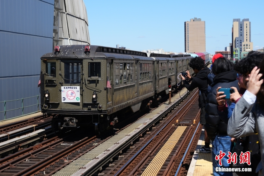 当地时间3月27日,为迎接美国职业棒球大联盟(MLB)纽约洋基队的主场比赛,纽约大都会交通局在中央车站和洋基球场间开行复古地铁专列(专列车辆在1917年至1960年间建造),当日仅开行两个单行车次,受到大批球迷追捧。图为专列在洋基球场车站吸引民众观赏。中新社记者 廖攀 摄