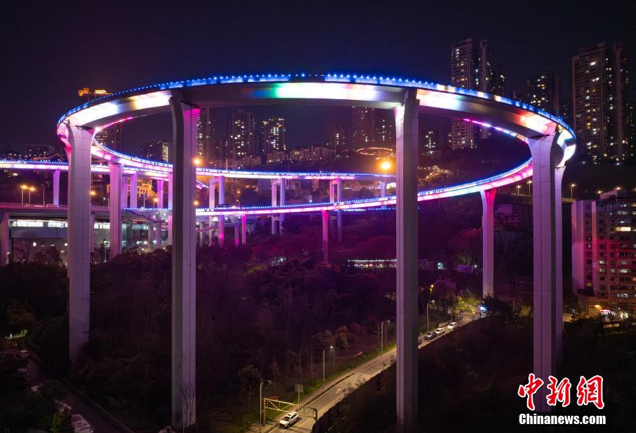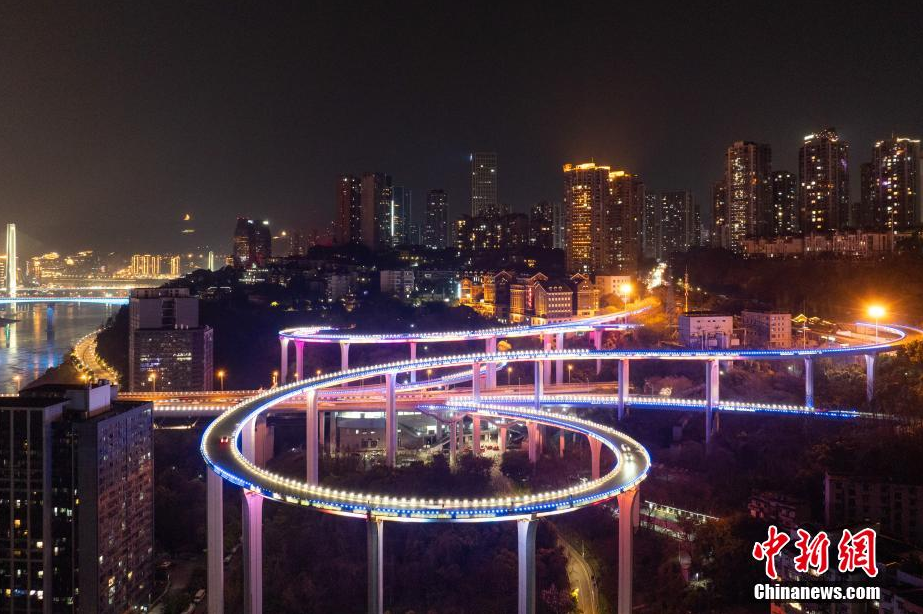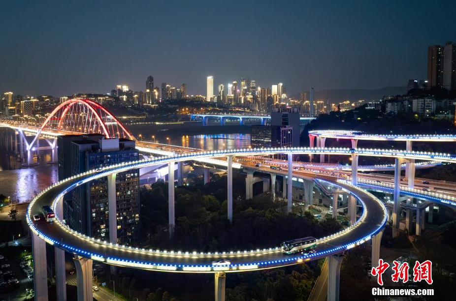 3月26日晚,航拍夜幕下的苏家坝立交。苏家坝立交桥位于重庆市南岸区,高72米,螺旋式的设计解决了重庆菜园坝长江大桥与城市道路之间的高低落差问题,是国内最具特色的交通枢纽之一。夜幕降临时,立交桥的灯光系统与城市夜景交相辉映,形成极具视觉冲击力的“赛博朋克”风格画面,展现着山城重庆的独特魅力。(无人机照片)中新社记者 何蓬磊 摄
