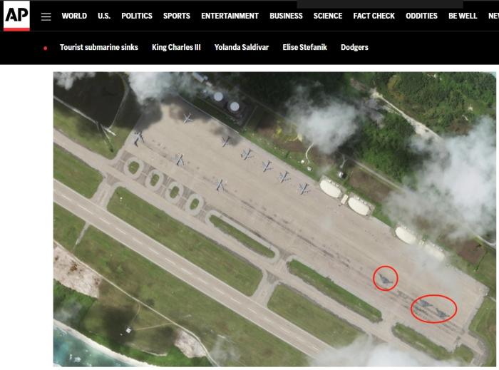 卫星图片显示,多架美军B-2(红圈处)已进驻迭戈加西亚基地。图/美联社