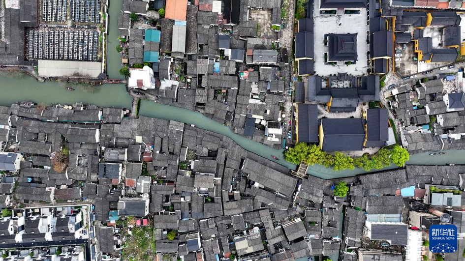这是3月29日拍摄的安昌古镇一景(无人机照片)。浙江省绍兴市柯桥区的安昌古镇是一个有千年历史的水乡古镇。绍兴千百年来的民俗风情在古镇大都得到保存和延续,错落有致的水乡建筑和特色浓郁的水乡风情吸引众多游客前来观光体验。新华社记者 王迎 摄