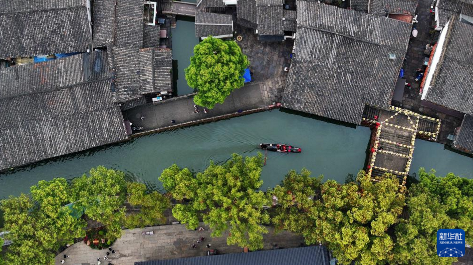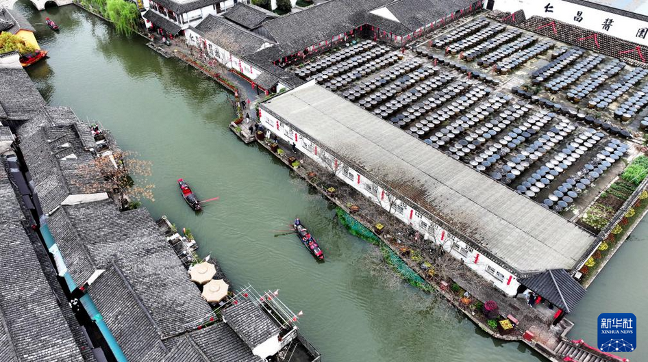 3月29日,乌篷船行驶在安昌古镇的河道上(无人机照片)。浙江省绍兴市柯桥区的安昌古镇是一个有千年历史的水乡古镇。绍兴千百年来的民俗风情在古镇大都得到保存和延续,错落有致的水乡建筑和特色浓郁的水乡风情吸引众多游客前来观光体验。新华社记者 王迎 摄