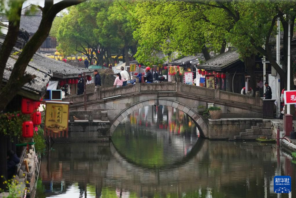 3月29日,人们走在安昌古镇的石桥上。浙江省绍兴市柯桥区的安昌古镇是一个有千年历史的水乡古镇。绍兴千百年来的民俗风情在古镇大都得到保存和延续,错落有致的水乡建筑和特色浓郁的水乡风情吸引众多游客前来观光体验。新华社记者 王迎 摄