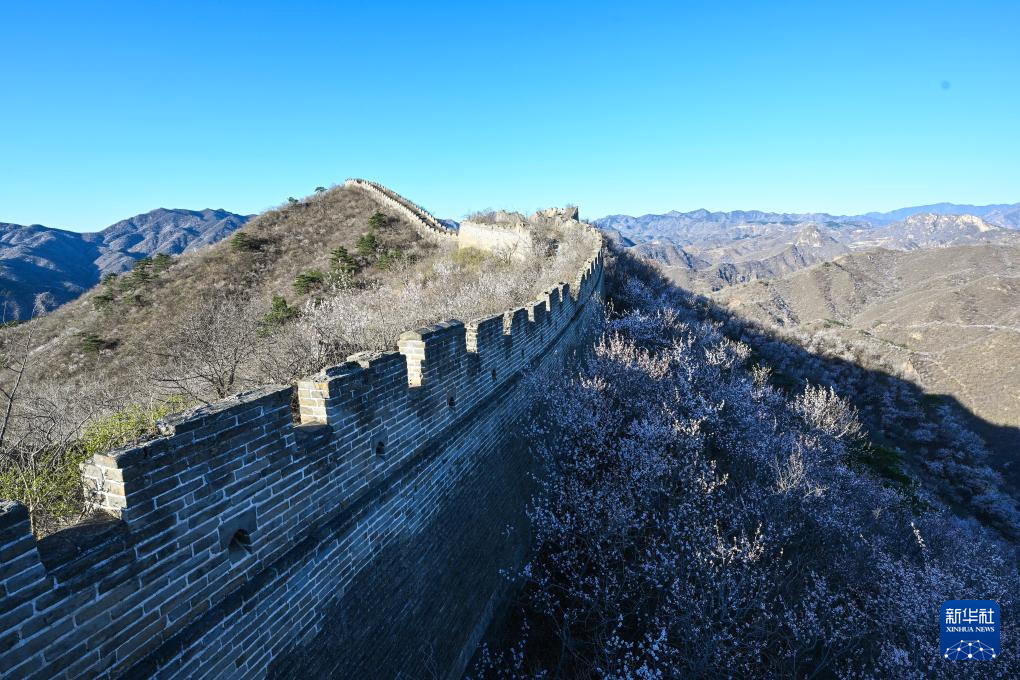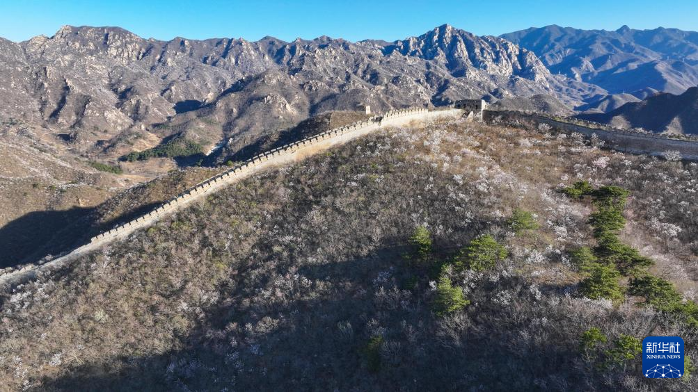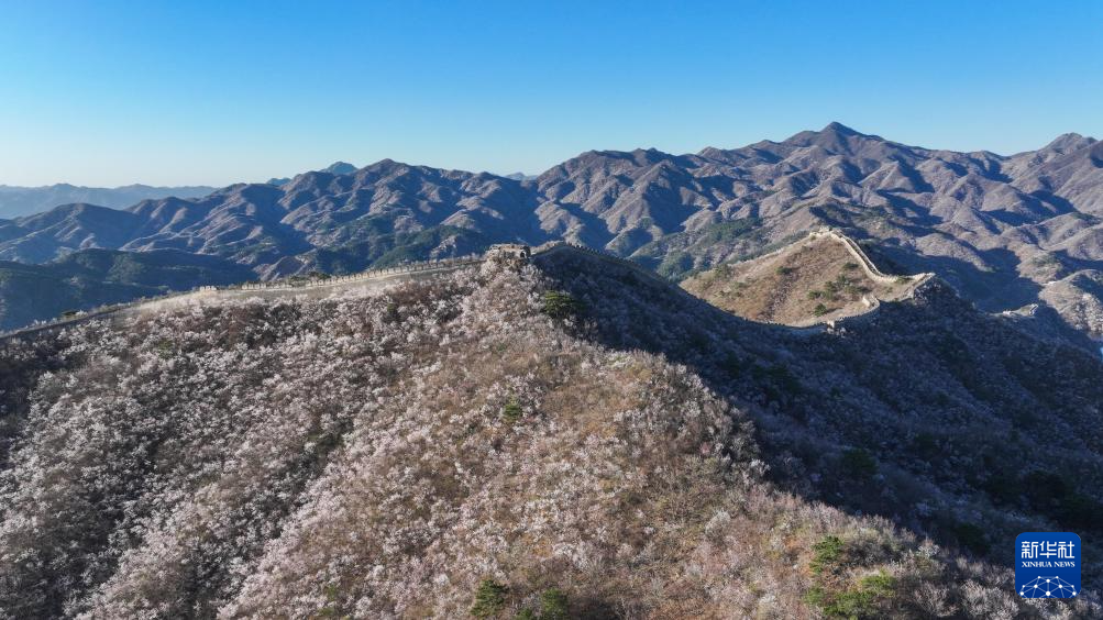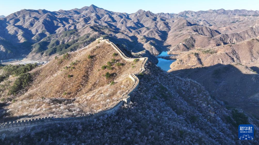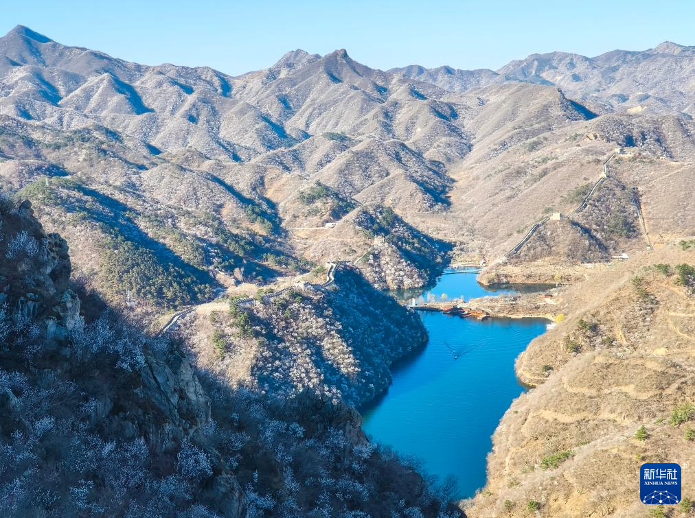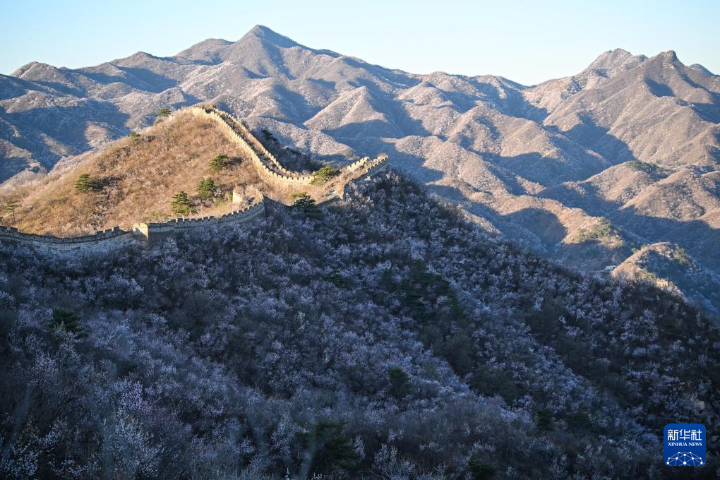仲春三月,位于北京市怀柔区的黄花城水长城、撞道口长城两侧山桃似锦、杏花如雪,与苍龙般盘踞的长城相映成画。
