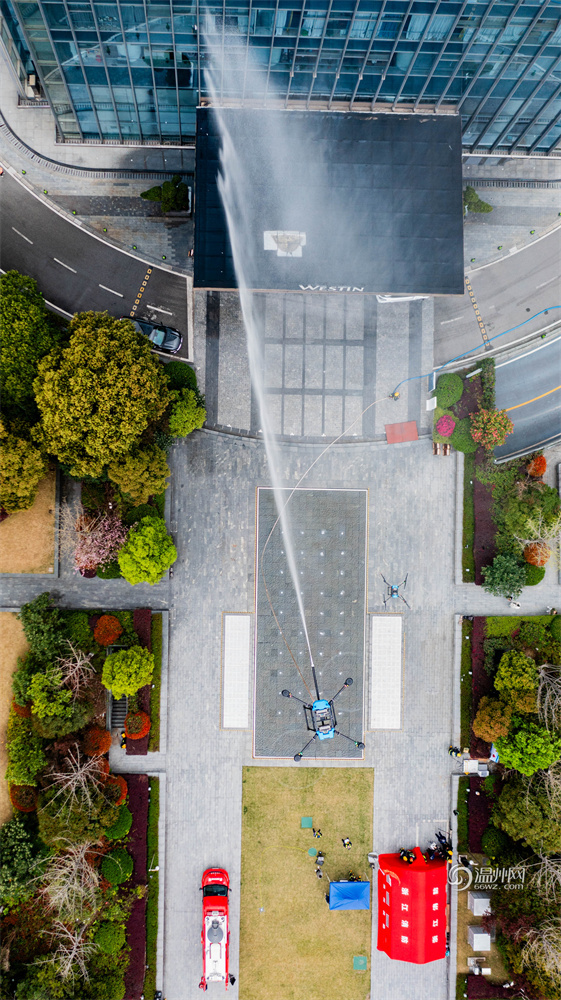 演练现场,一架搭载着超轻水带与碳纤维喷枪的灭火无人机,在消防救援人员的操控下,悬停在200米高空进行出水作业,精准打击高空外立面“火源”。