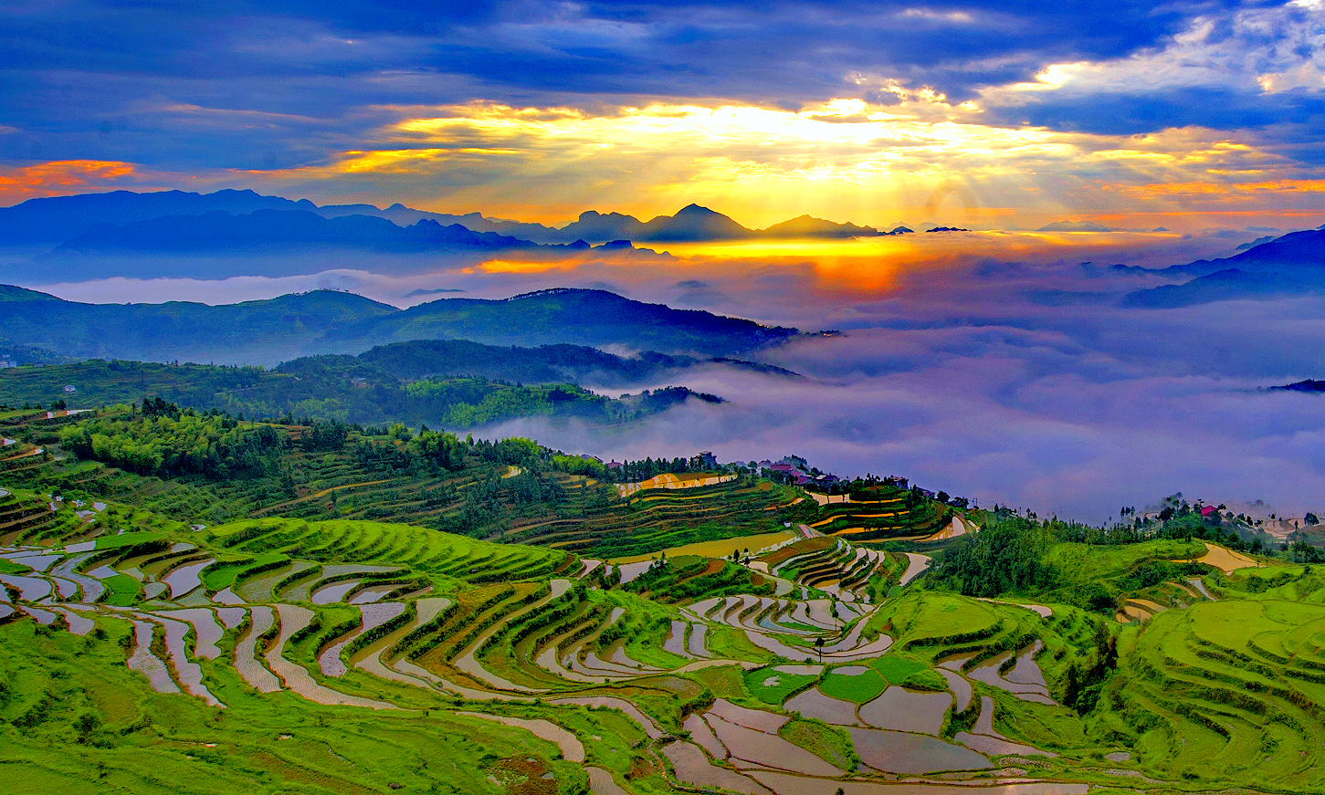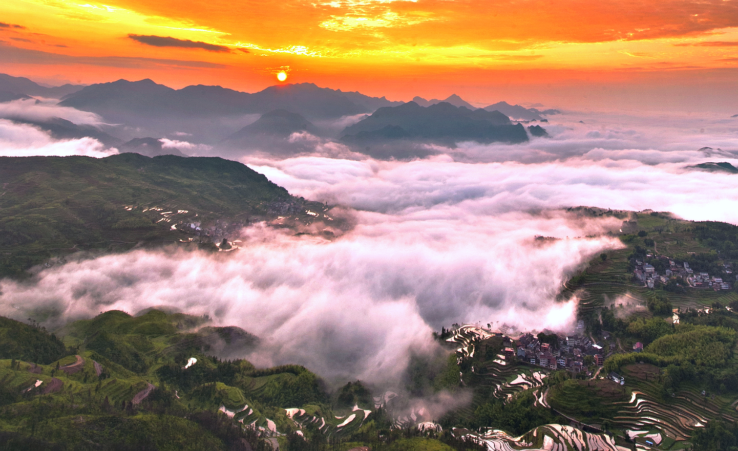 永嘉茗岙梯田与村舍相依,山恋与朝霞共美,这里是个经常起雾的地方,如诗如画,仿佛就是人间仙境,人间天堂。叶卫周 摄