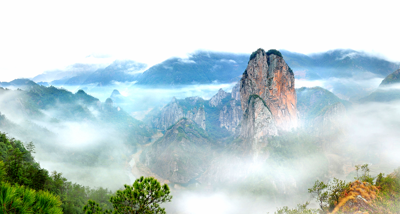 永嘉楠溪江石桅岩雄伟壮丽,在云雾的妆扮下宛如仙境。叶卫周 摄