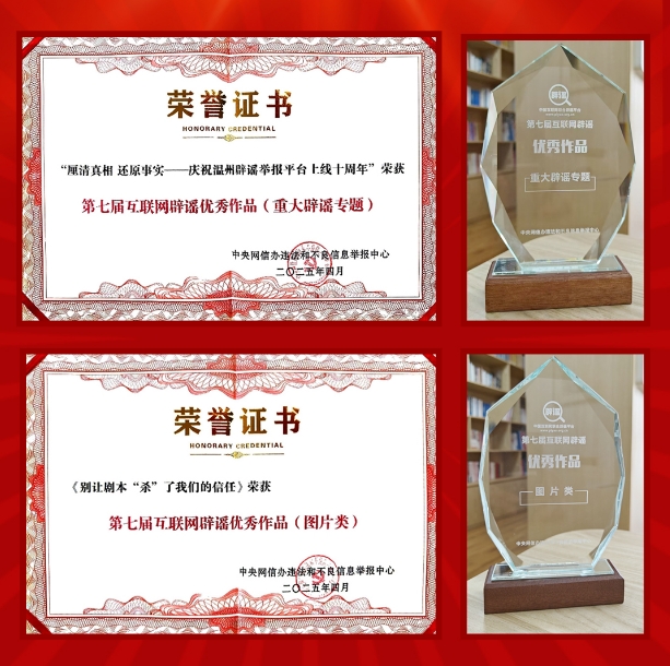 第七届互联网辟谣优秀作品共分为“文字类”“图片类”“音视频类”“重大辟谣专题”和“优秀辟谣平台(账号)”五个类别。自今年1月启动作品征集以来,共收到1976家单位和个人报送的3449部作品,征集数量创历年新高。经过作品初审、网络投票、专家复审和综合评定,温州辟谣举报平台作品《厘清真相 还原事实——庆祝温州辟谣举报平台上线十周年》和《别让剧本“杀”了我们的信任》从众多作品中脱颖而出,分别荣获“重大辟谣专题”和“图片类”优秀作品殊荣。