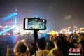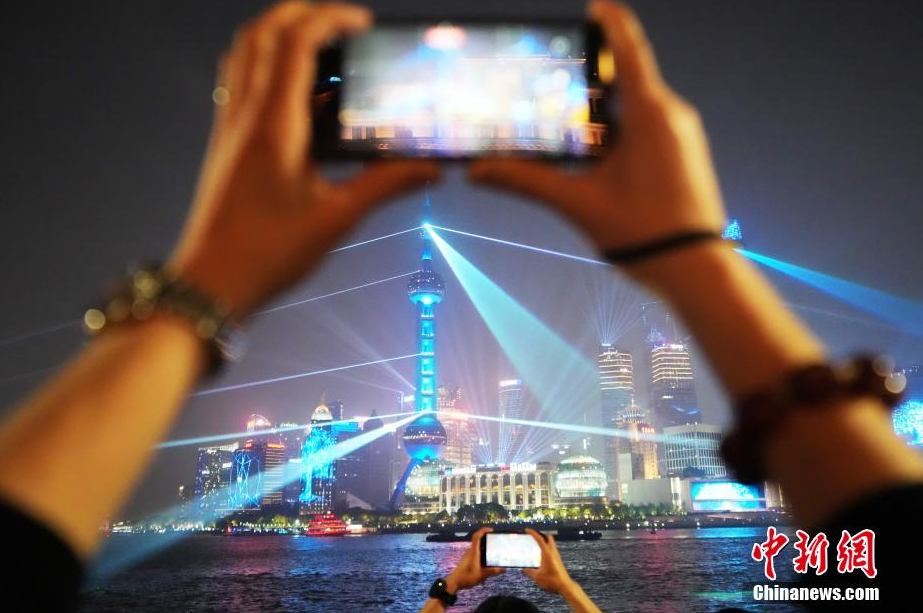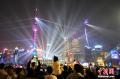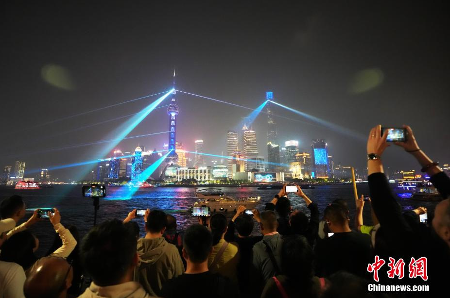 4月19日晚,为庆祝浦东开发开放35周年,上海黄浦江畔举行“潮涌东方,光启未来”主题展演,吸引民众欣赏光影盛宴。中新社记者 张亨伟 摄