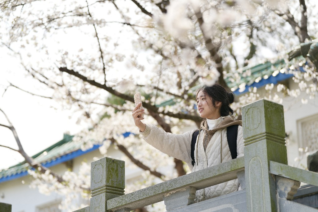 市民纷纷与樱花合影,记录春日美景。作者:潘益慧 陈浩 孙雯雯