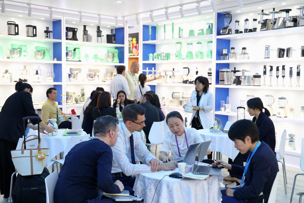 4月15日,在第137届广交会开幕当天,海外客商在一家电器公司的展区洽谈。 新华社记者 刘大伟 摄