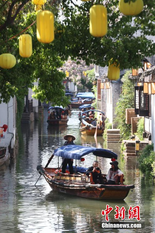 4月26日,江苏苏州,游客乘船游览周庄古镇。周庄原名贞丰里,以“青砖白墙黛瓦,小桥流水人家”的风光著称,享有“中国第一水乡”美誉。中新社记者 泱波 摄