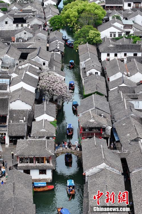 4月26日,江苏苏州,游客乘船游览周庄古镇。周庄原名贞丰里,以“青砖白墙黛瓦,小桥流水人家”的风光著称,享有“中国第一水乡”美誉。(无人机照片)中新社记者 泱波 摄