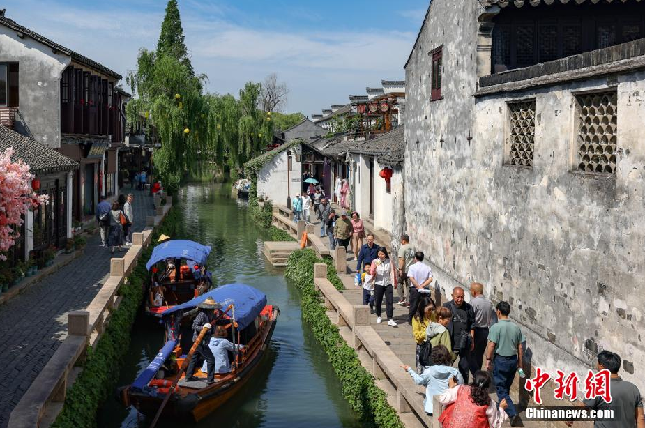 4月26日,江苏苏州,大批游客走进周庄古镇参观。周庄原名贞丰里,以“青砖白墙黛瓦,小桥流水人家”的风光著称,享有“中国第一水乡”美誉。中新社记者 泱波 摄