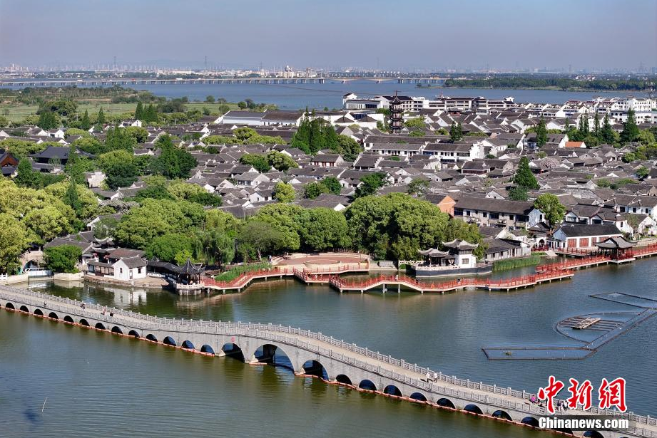 4月26日,江苏苏州,航拍周庄古镇。周庄原名贞丰里,以“青砖白墙黛瓦,小桥流水人家”的风光著称,享有“中国第一水乡”美誉。(无人机照片)中新社记者 泱波 摄