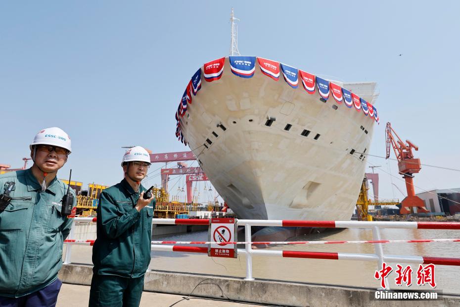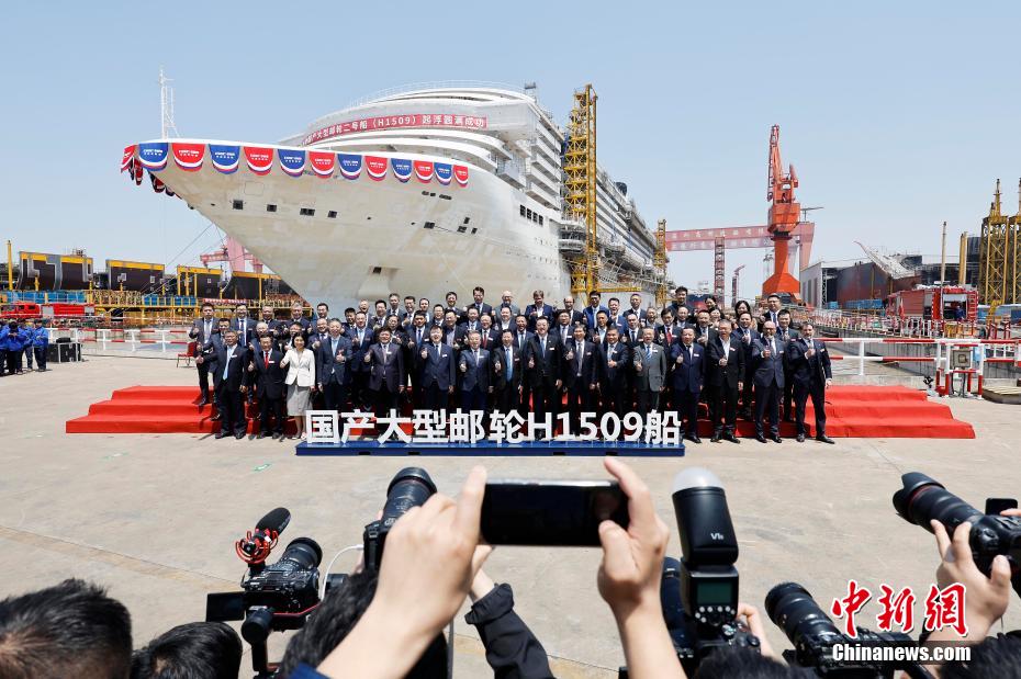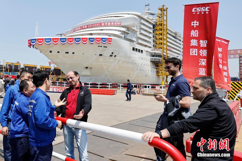 4月28日,第二艘国产大型邮轮“爱达·花城号”(H1509)在中国船舶集团有限公司旗下上海外高桥造船有限公司顺利实现坞内起浮的里程碑节点,从结构和舾装建造的“上半场”全面转入内装和系统完工调试阶段。中新社记者 殷立勤 摄