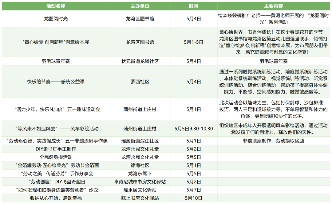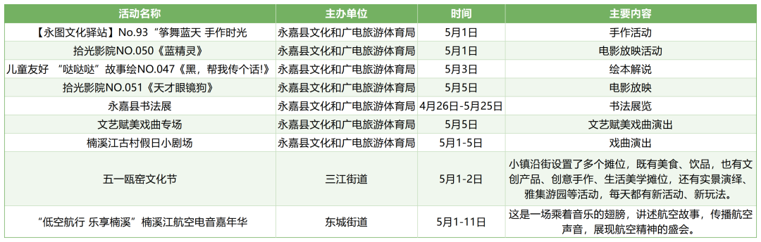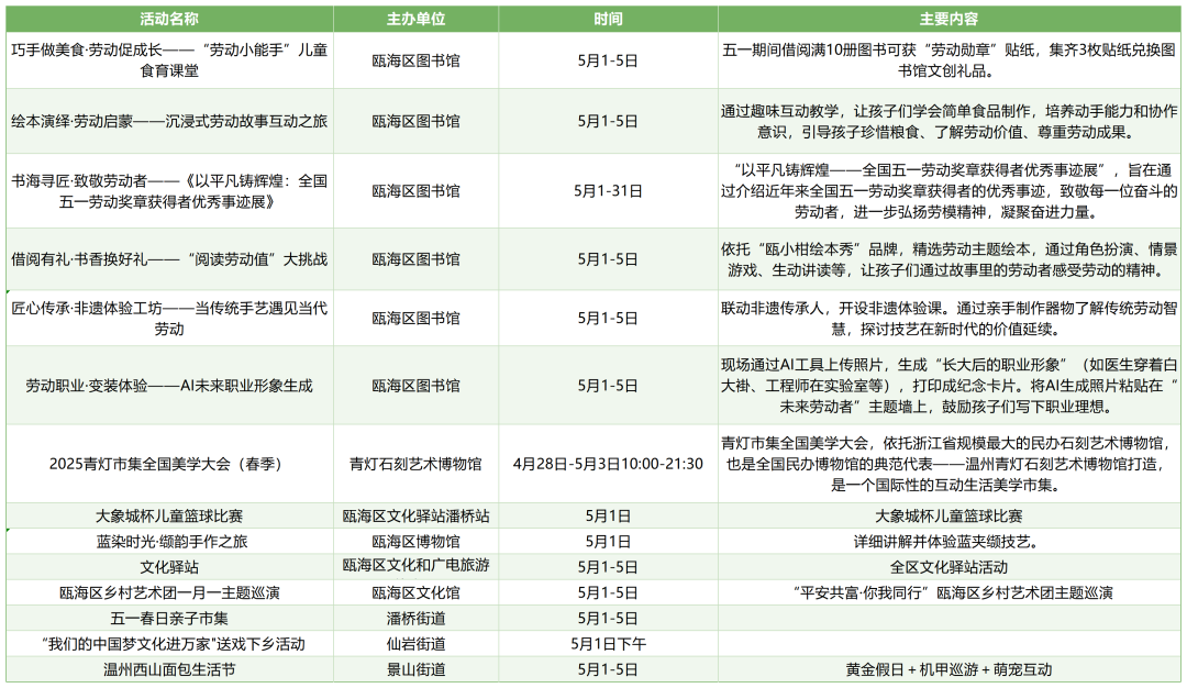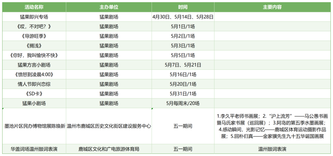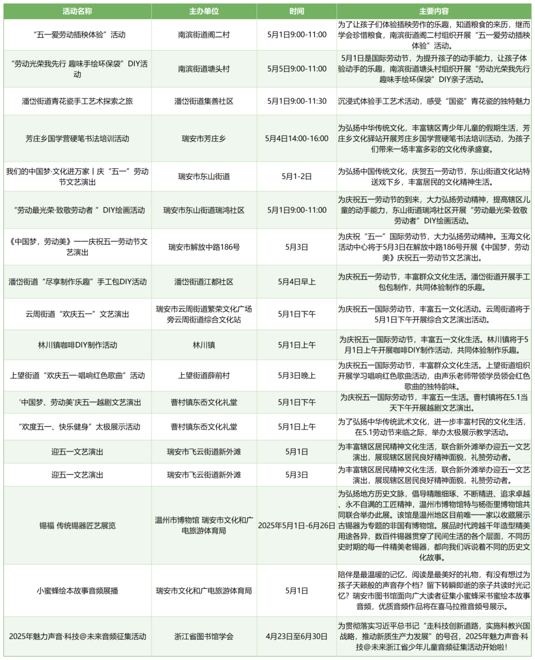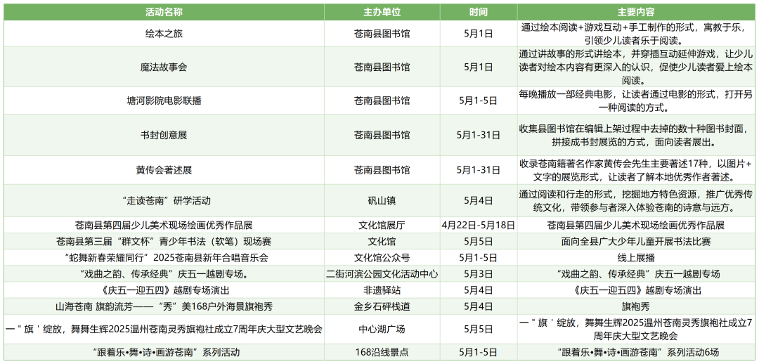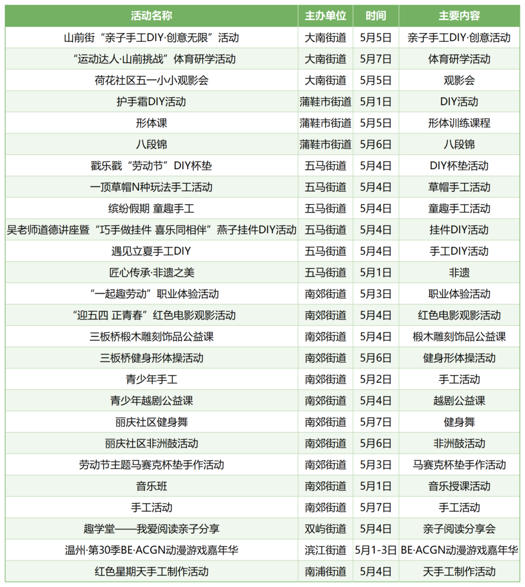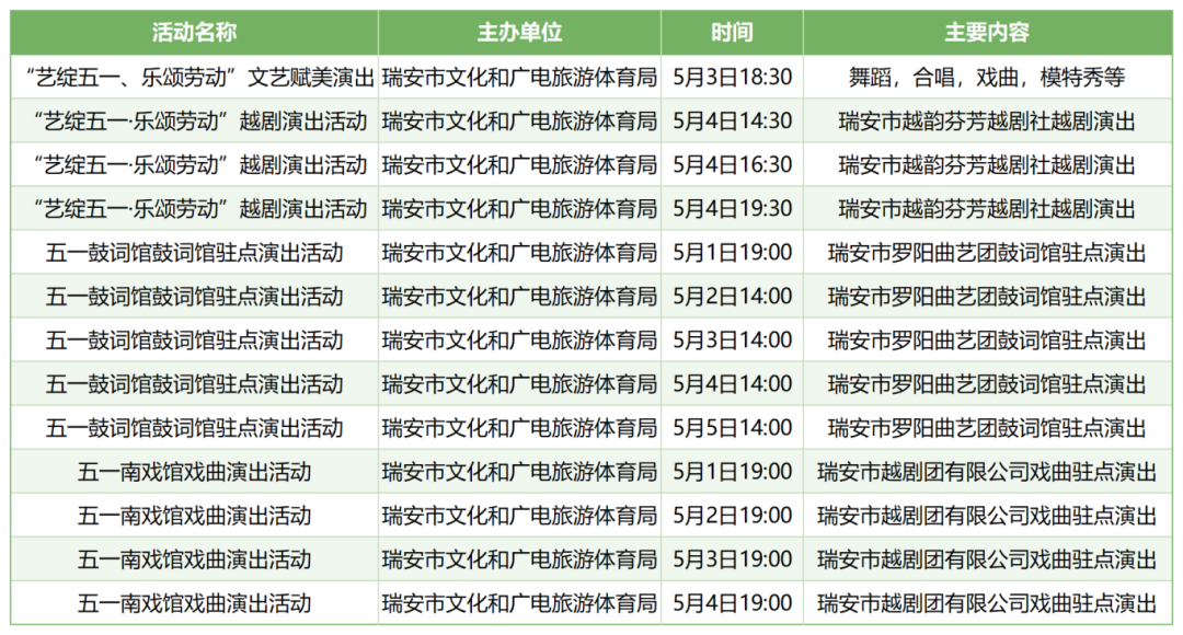 五一假期将至,温州市文化广电旅游局联合各县(市、区)文旅主管部门共同推出几百场多姿多彩的群文活动,带您开启丰富而充实的假期之旅。