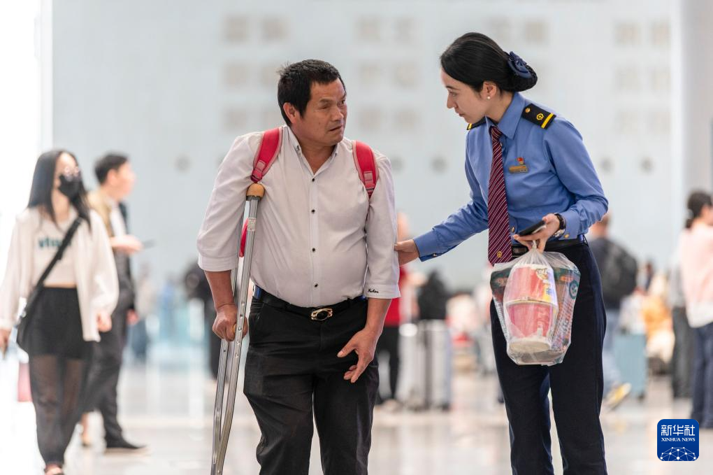 4月29日,在浙江金华站,铁路工作人员帮助行动不便的旅客进站乘车。新华社发(胡肖飞 摄)