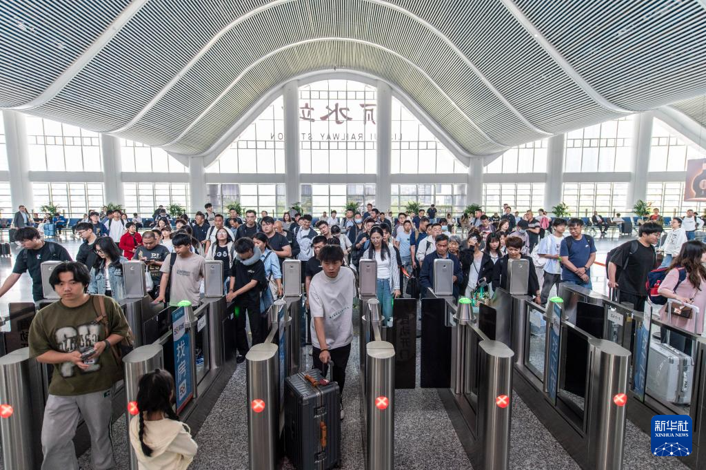4月29日,旅客在浙江丽水站有序进站。新华社发(胡肖飞 摄)