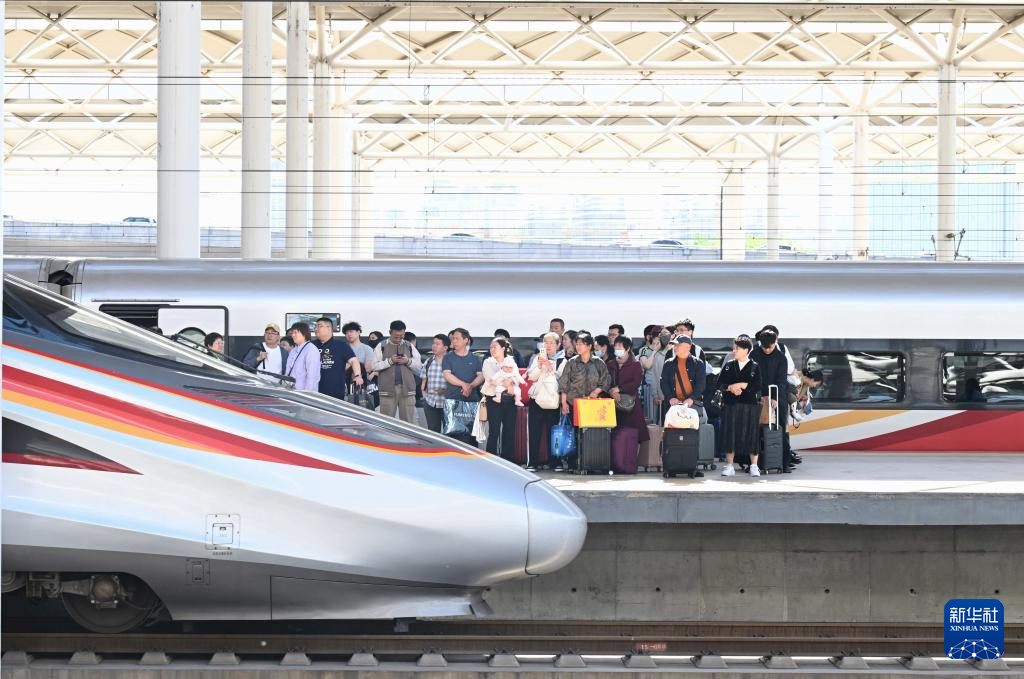 4月29日,旅客在江苏扬州站准备登车出行。新华社发(孟德龙 摄)