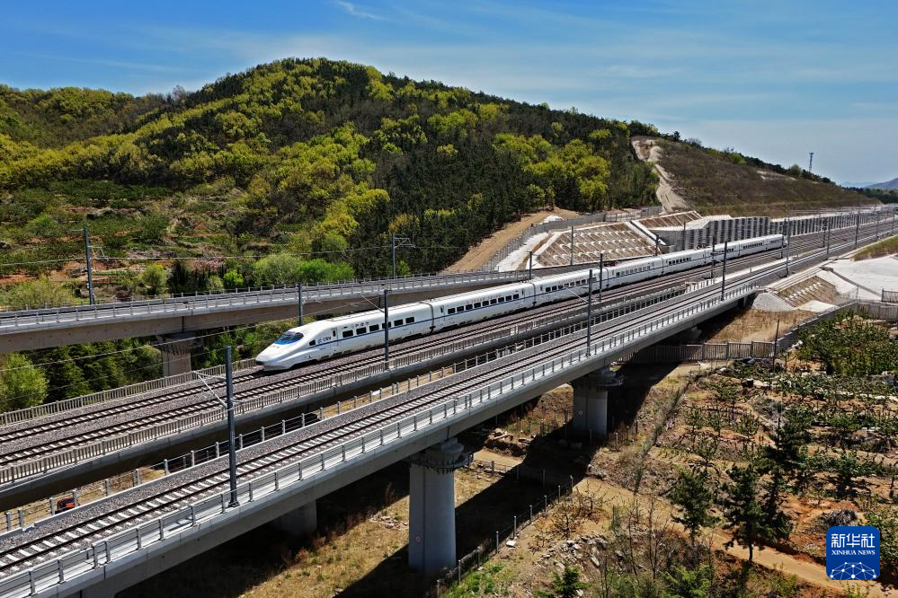 4月29日,动车组列车行驶在山东省烟台市境内(无人机照片)。新华社发(孙文潭 摄)